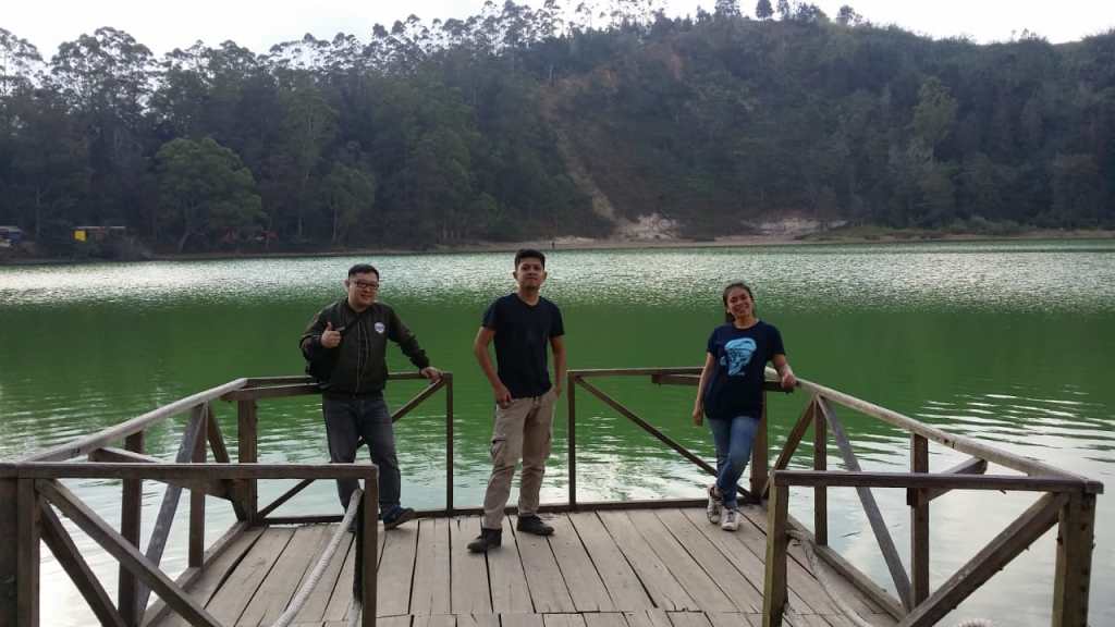 Nah, karena penasaran dengan bagaimana penampakan Telaga Warna dari dekat, dari Batu Ratapan Angin kami “turun” menuju obyek wisata Telaga Warna. Harga tiket masuknya Rp15.000,00. Setelah masuk ke dalam, ternyata Telaga Warna itu memang paling bagus dinikmati dari ketinggian haha. Kalau nggak buru-buru, rasanya pengen ngopi-ngopi dulu di depan telaga kayak yang dilakukan sekelompok wisatawan anak muda.
