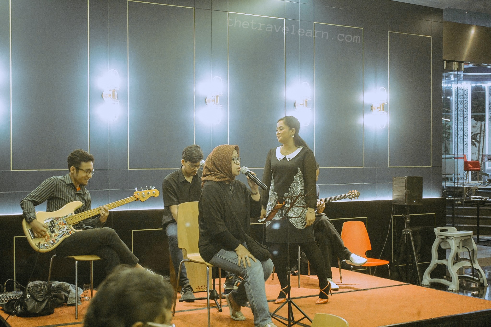 Pertunjukkan musik di Friday Delight Mercure Nexa Bandung Supratman, ibu-ibu berjilbab itu adalah tamu yang ikut bernyanyi