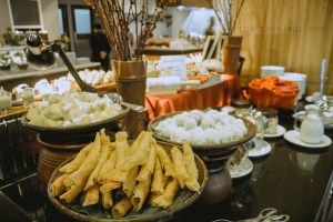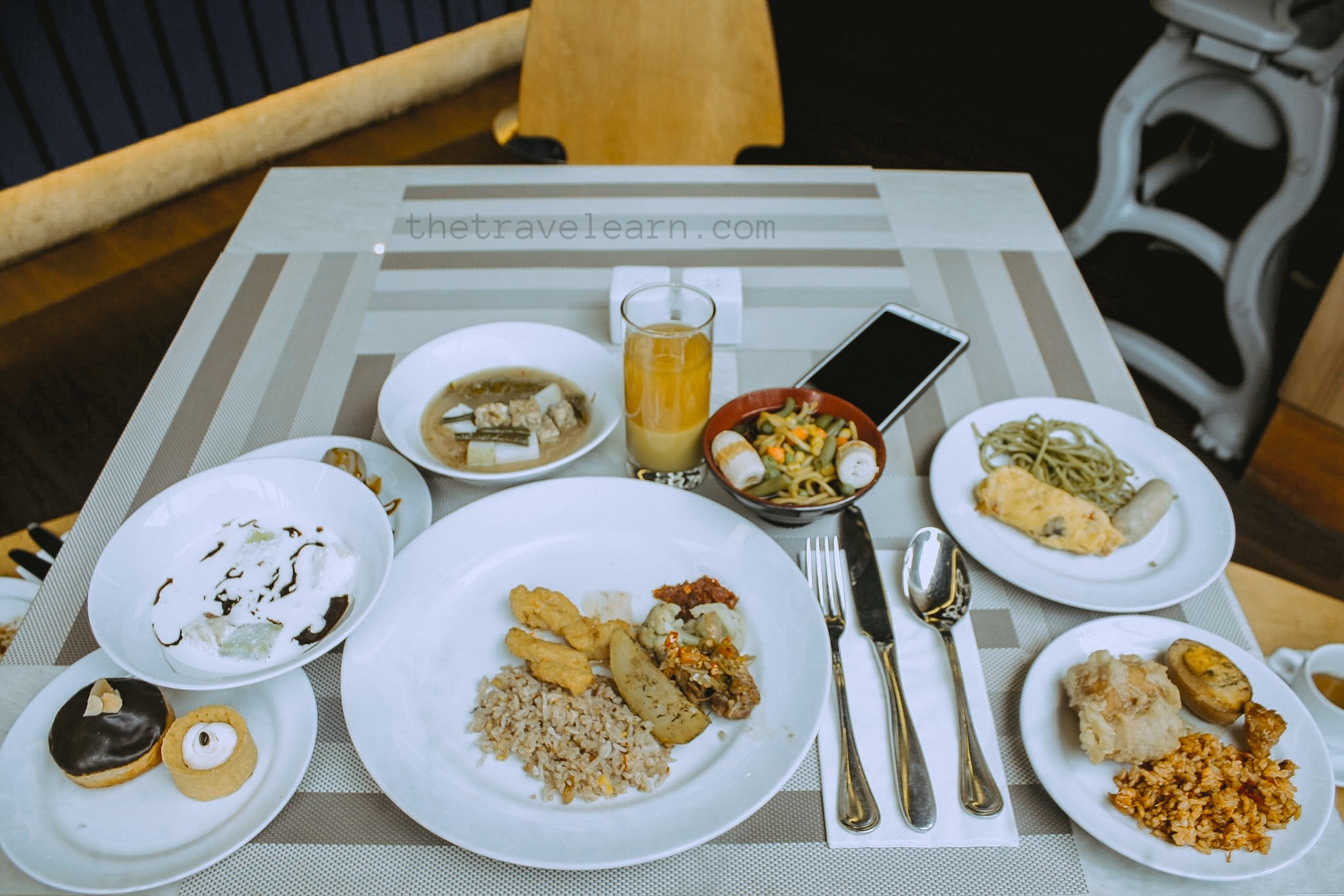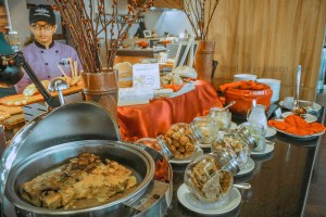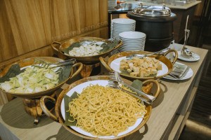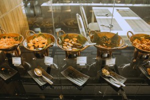 Seperti yang diharapkan, sajian menu sarapannya lengkap dengan penyajian yang berkelas. Ada main course bertema nusantara dan western. Beberapa menunya adalah ikan goreng tepung dan mie goreng. Selain nasi putih, juga tersedia nasi goreng dan nasi tutug oncom khas Jawa Barat, enak loh. Nasi tutug oncomnya dihadirkan bersama lauk pauk ala sunda seperti tahu, telur pindang, tumis genjer. Menu western hadir dalam rupa potato wedges, pasta, sosis goreng, dan omelet. Selain buah dan roti tawar, menu pendamping lainnya adalah macam-macam kue, macam-macam roti, gorengan, ramen, bubur kacang ijo, dan cilok.