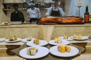 Tapi sebetulnya, 2 produk utama Friday Delight di Mercure Nexa ini adalah sushi dan barbekyuan―namanya juga “barbecue buffet dinner” yekan. Konter sushi ada di dekat pembatas imajiner area restoran dan area lobi. Jangan cemas, sushi-nya bukan sushi mentah namun sudah sushi fusion yang disesuaikan dengan lidah nusantara. Konter barbekyu ada di ujung area, di bagian luar restoran. Ada 3 jenis barbekyu yang disediakan, yaitu sate, chicken wing, dan gyumaki. Gyumaki ini semacam lembaran daging yang lalu digulung seperti lumpia, di dalamnya ada sayuran. Untuk mendampingi sajian barbekyu, bermacam-macam saos bisa kita pilih dari konter.