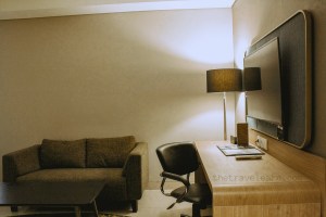 Kamar Grand Deluxe Room ini dilengkapi dengan fasilitas coffee & tea maker dan minibar. Sepasang nakas ditempatkan di kedua sisi ranjang, masing-masing dilengkapi dengan colokan listrik. Yang gue suka banget adalah working space-nya yang legaaa. Mejanya dirancang memanjang, sangat cukup untuk meletakkan laptop dan printilan-printilan lainnya. Meja itu disandingkan dengan kursi putar yang nyaman.
