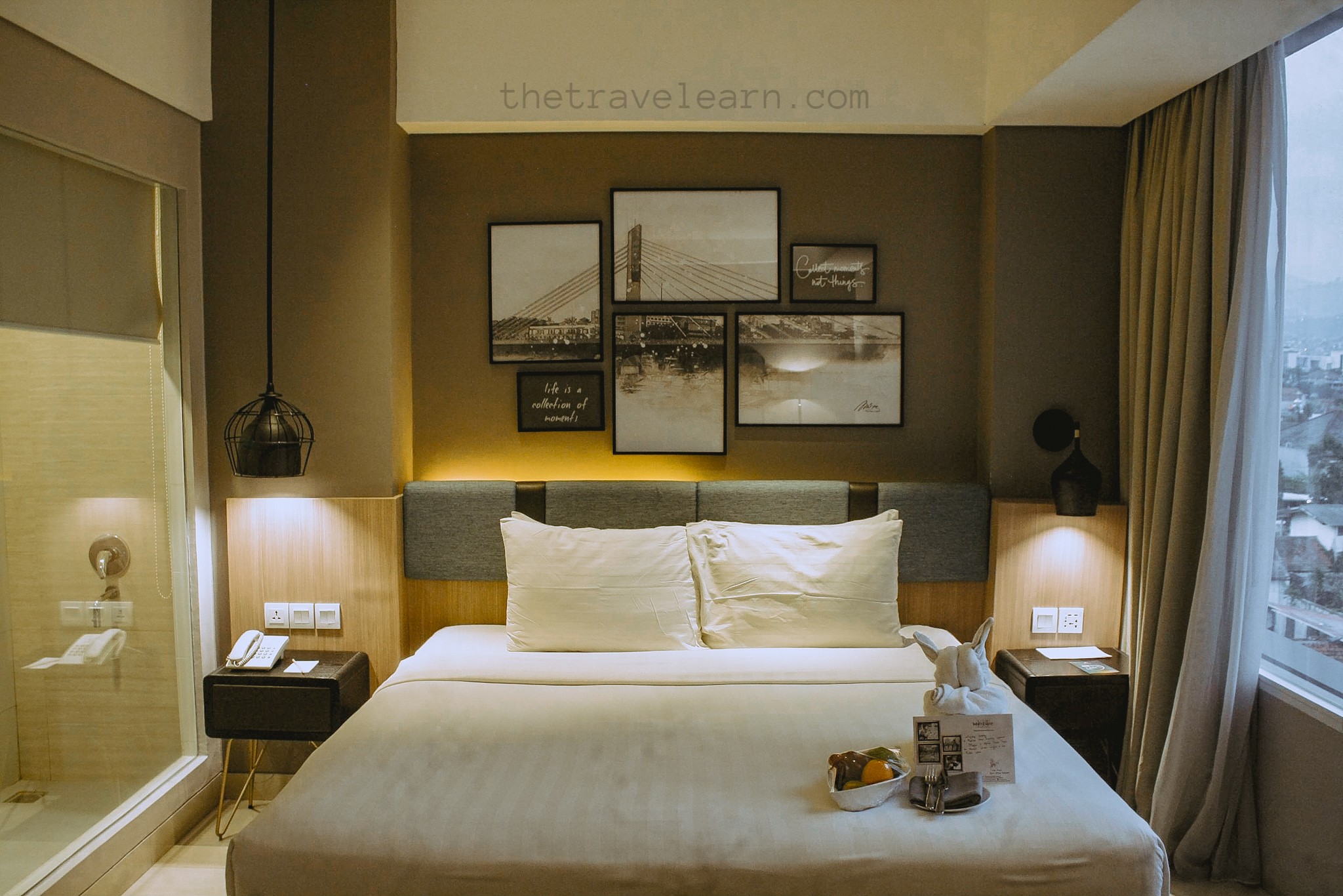 Masuk ke dalam kamar Grand Deluxe Mercure Nexa yang sudah dipersiapkan, dan gue dibuat takjub dengan desain interior kamarnya! Sebuah personal greeting card dengan complimentary fruit dan handuk yang dibentuk menyerupai kelinci (?) membuat gue semakin merasa disambut hangat. Ternyata gue dikepoin Mercure Nexa, hehe. Baru kali ini gue menginap di kamar yang dilengkapi dengan living room. Sofa berwarna abu-abu itu tampil serasi dengan warna dinding yang membingkai kamar. Pada salah satu sisi dinding kamar, sebuah jendela besar menampilkan panorama kota Bandung dari lantai 6.
