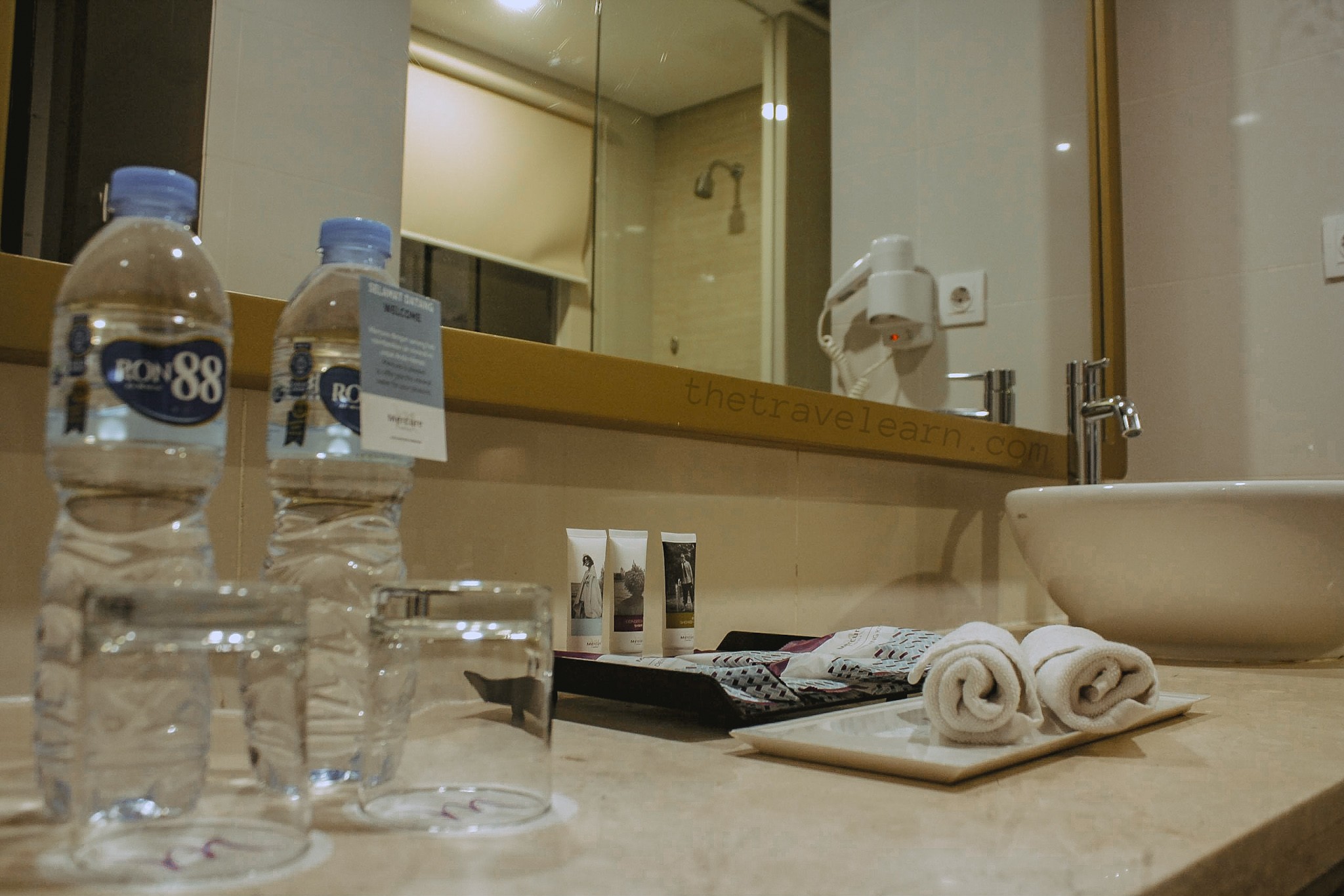Tiga fasilitas terbawah biasanya gue temukan di bedroom area. Namun uniknya, Mercure Nexa Bandung Supratman menempatkannya di bathroom area. Karena di situ ada 2 botol air mineral, jadi total ada 4 air mineral di dalam kamar.