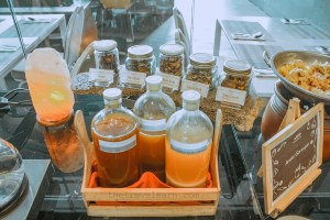 Yang patut diapresiasi lagi dari menu sarapan Mercure Nexa adalah pilihan minumannya. Nggak cuma kopi dan teh yang udah jadi menu standar, ada jamu jugaaaaaa! Wah, jiwa Jawa gue bergetar melihat jamu. Susu yang biasa mendampingi konter sereal disediakan dalam pilihan dingin dan hangat, ada susu vanilla dan cokelat. Mantep, ‘kan?