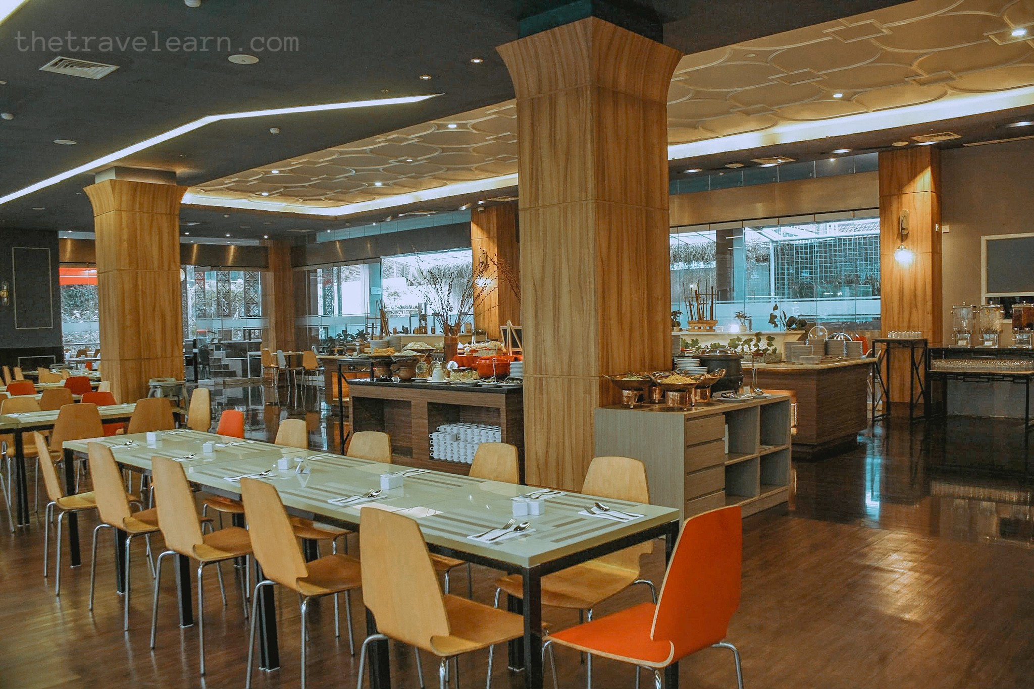 Sekarang kita bahas tempat sarapannya, yok. Selain luas, hal yang gue suka dari restoran Mercure Nexa ini adalah akses cahaya alami dari kedua sisi. Gue memang lebih suka ruangan semi terbuka daripada yang tertutup sama sekali. Nyaman, adem, tapi nggak suram, sirkulasi cahaya alami itu menciptakan kesan sehat dan bersemangat. Ada indoor dan outdoor seating area yang dibatasi oleh partisi dengan kolam renang di sampingnya. Di salah satu sisi areanya juga ada soccer table, semalam gue lihat nggak ada karena spotnya dipakai untuk barbekyu.