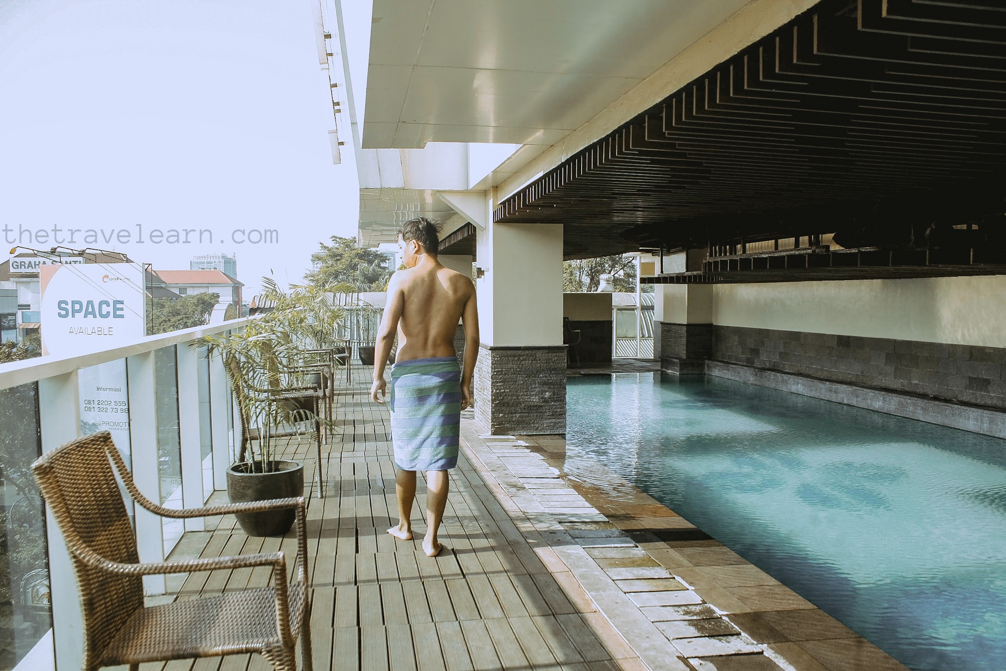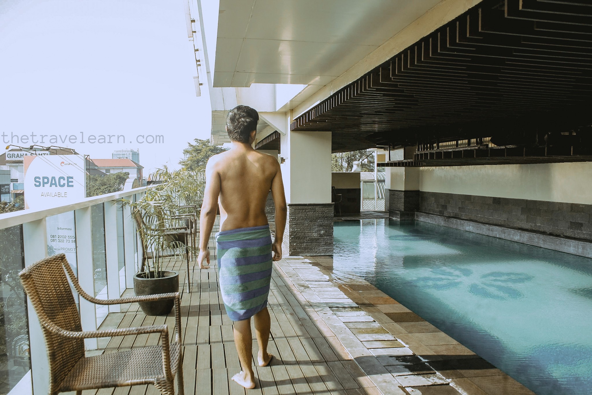 Kolam renang dilengkapi dengan kursi-kursi dan coffee table yang ditata mengelilingi kolam. Lantai di sekitar kolam dilapisi kayu, jadi nggak terasa licin. Ada konter peminjaman handuk yang terletak sebelum memasuki area kolam. Meski “cuma” di lantai 4, tapi hembusan anginnya udah terasa cukup setrong lho. Apa kabar kalo ada di rooftop ya, bisa terbang kali gue.