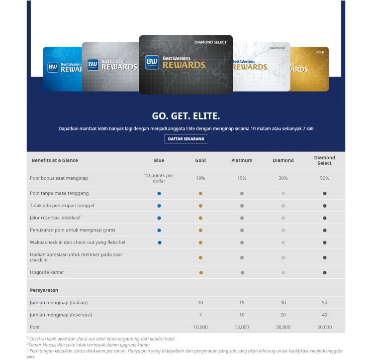 - Poin dapat ditukar dengan menginap gratis di seluruh hotel Best Western sedunia, miles penerbangan, voucher belanja, dsb