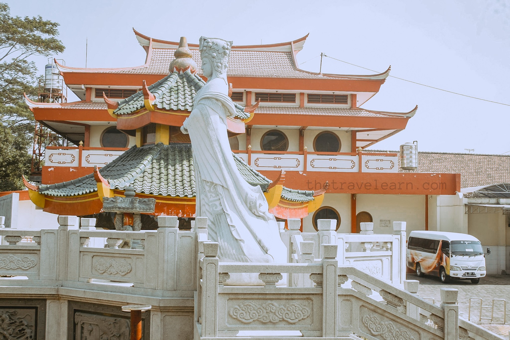 Di sisi bangunan utama ada gedung bertingkat yang sepertinya difungsikan untuk kegiatan pengurus dan jemaat. Gue sempet masuk ke dalam toiletnya yang gelap dan seperti terbengkalai, tapi airnya masih berfungsi. Bagian paling menarik adalah patung Sang Dewi Welas Asih, Guan Yin atau Avalokitesvara, di seberang bangunan utama. Sang Dewi dibangun tidak terlalu tinggi dan masih terlihat baru. Wajahnya yang tenang menghadap ke arah Sungai Brantas.