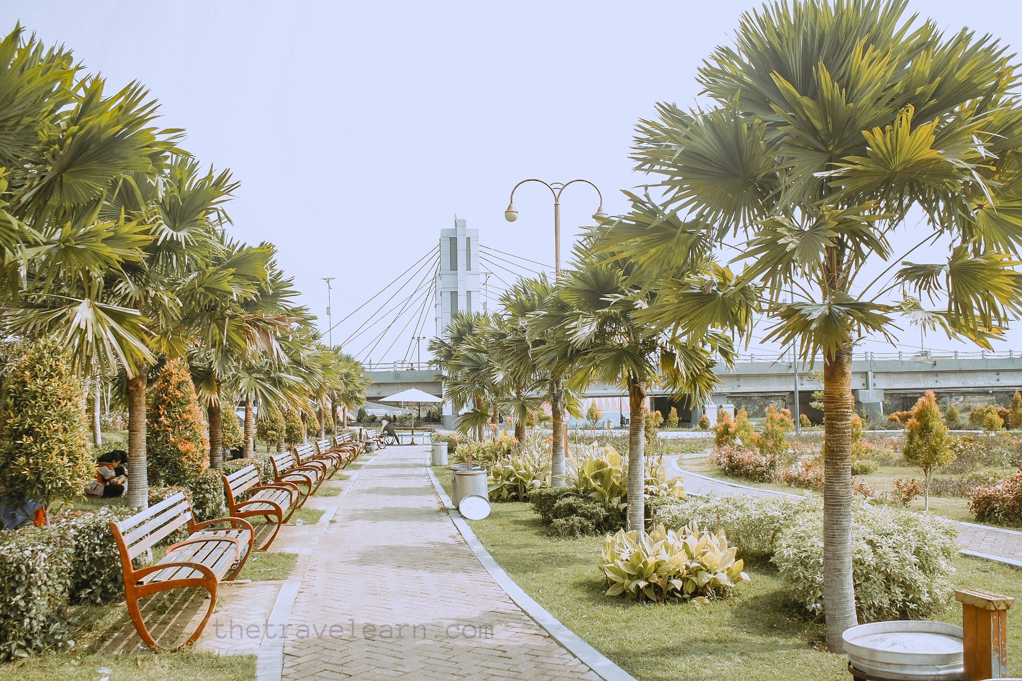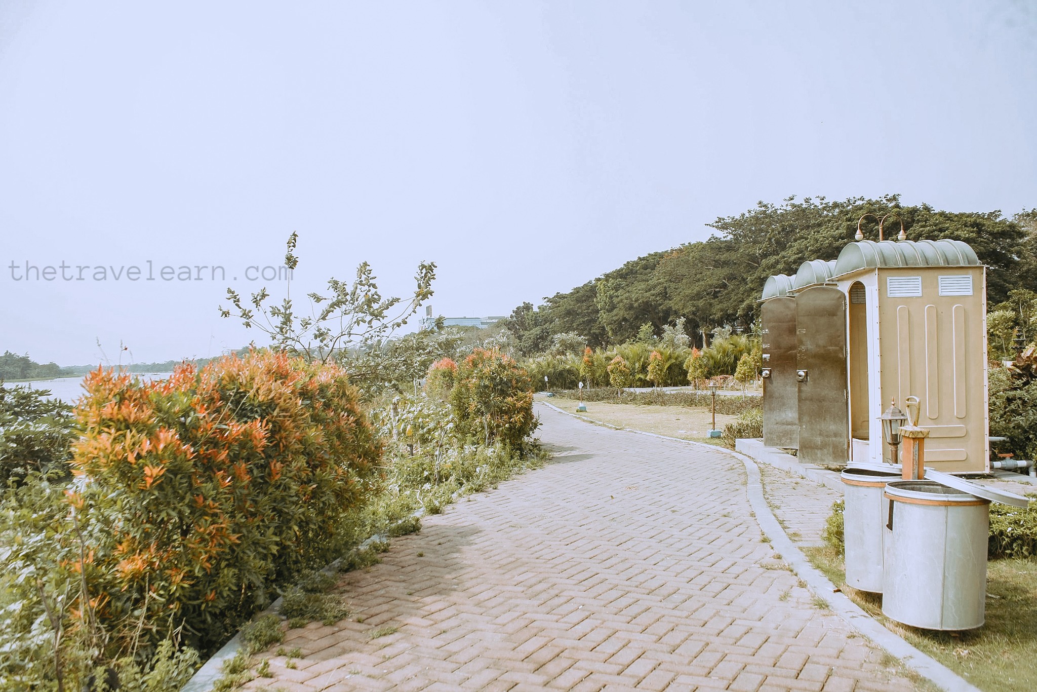 Gue lalu berjalan menuruni undakan untuk menjelajah lebih dalam. Taman Brantas rupanya diisi dengan jalur pejalan kaki dan bangku-bangku santai yang berjajar rapi di tepi jalur pedestrian. Tempat sampah dan toilet pun tersedia.