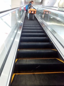 - Eskalator panjang menuju peron stasiun skytrain di Terminal 2 Bandara Internasional Soekarno-Hatta