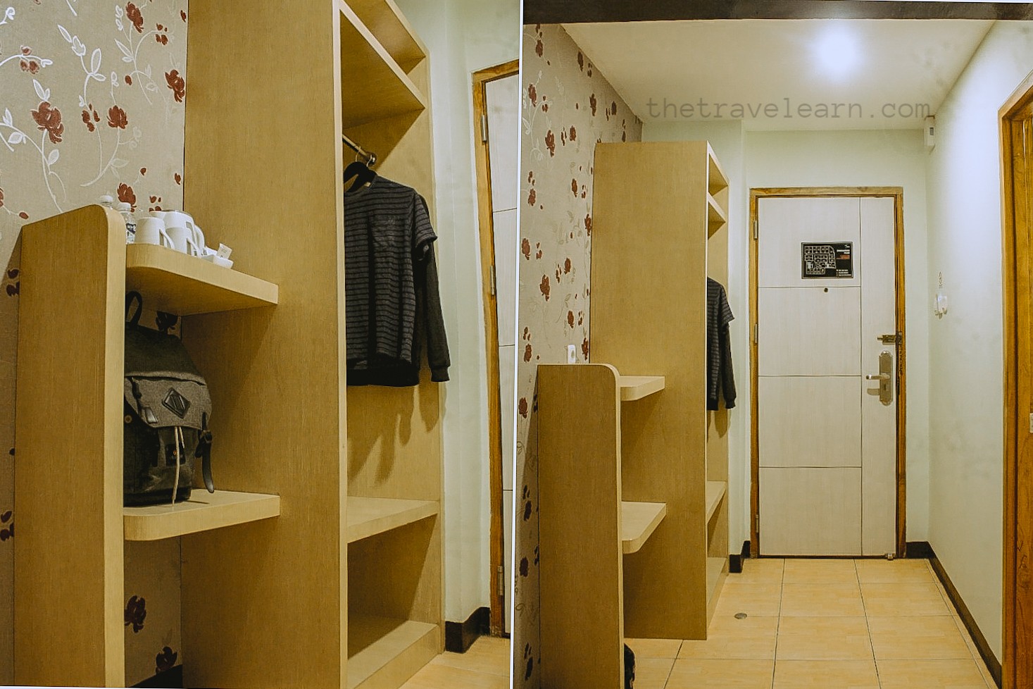 Begitu buka pintu, wah, langsung disambut kamar yang luas! Kaki melangkah masuk melalui sebuah lorong pendek dengan hanging corner di sisi kanan dan kamar mandi di sisi kiri. Hanging corner dilengkapi area penyimpanan yang kaya.