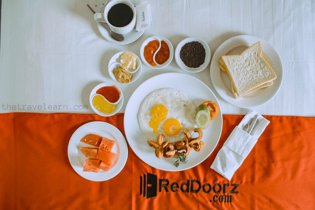 Nggak lama setelah gue balik ke kamar, sarapannya dateng. Gue nggak berharap banyak sama porsi dan penyajiannya, tapi begitu lihat sendiri―whoa, this was beyond my expectation! Sarapan terdiri dari roti tawar, telur mata sapi, sosis goreng, buah, dan secangkir kopi panas. Disajikan dengan mentega, meses, beberapa macam selai, saus sambal, dan alat makan yang lengkap. Kenyangnya pas! Gue sama sekali nggak nyangka bahwa momen breakfast on bed gue pertama kali ini dipersembahkan oleh RedDoorz.