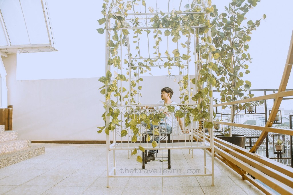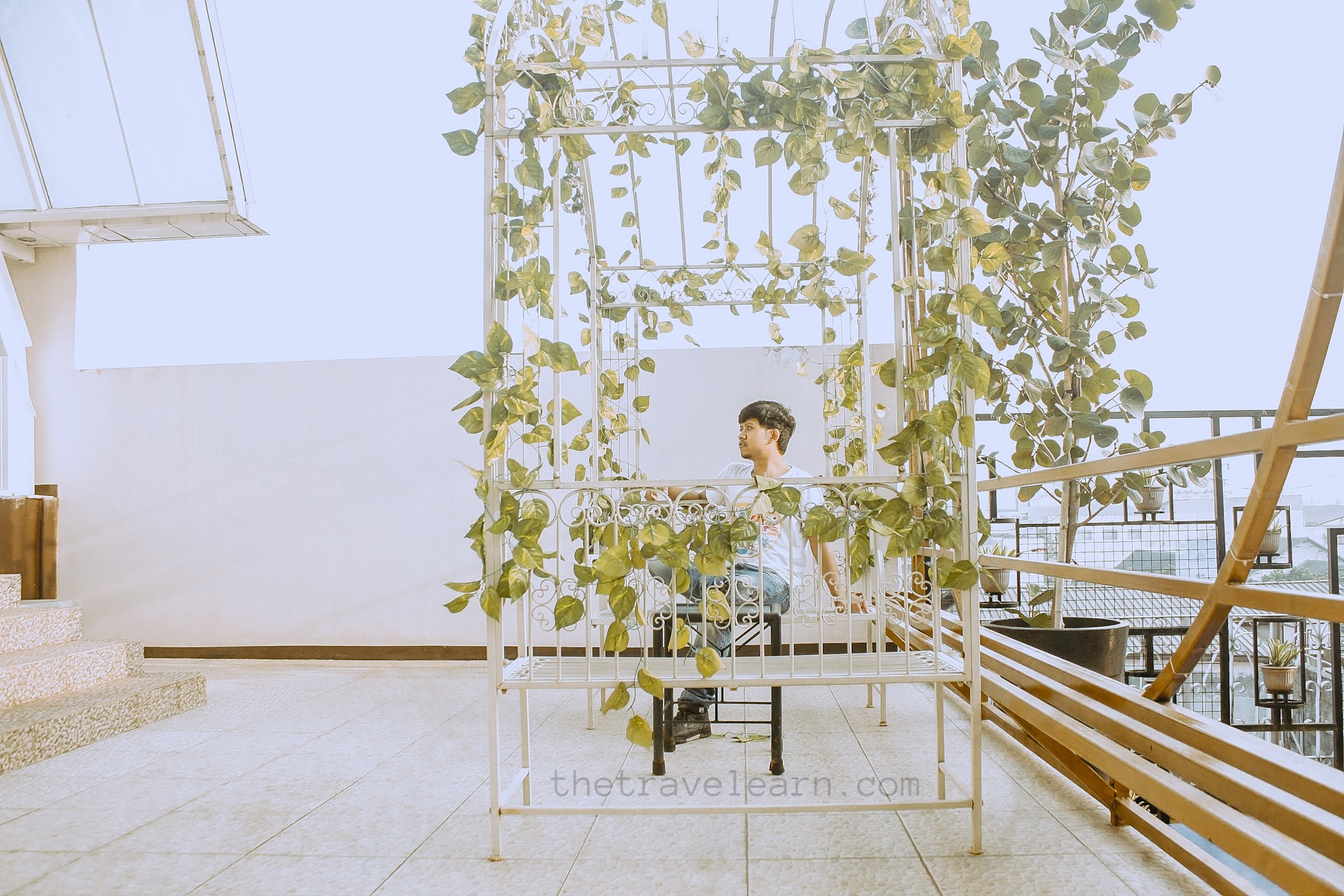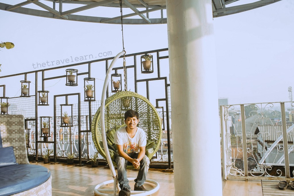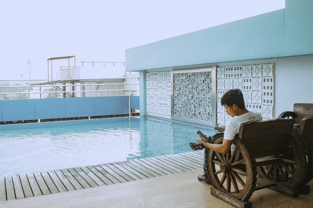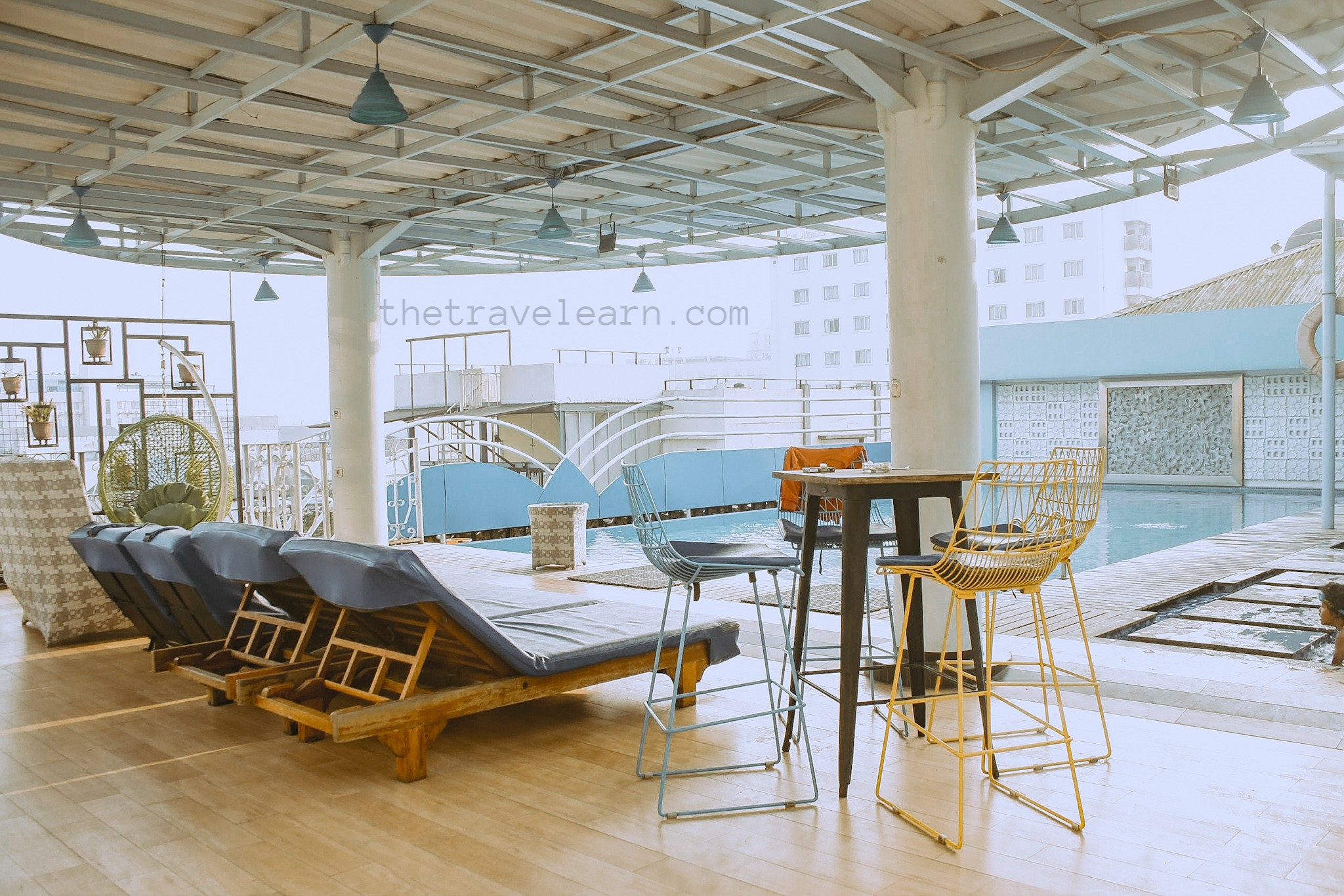 Karena nggak mau keduluan tamu-tamu lain, gue sengaja ke rooftop pagi-pagi banget sekitar jam 6 pagi. Ada kolam renang dewasa, juga ada kolam renang buat anak-anak. Seating area-nya macem-macem. Ada flatbed di tepi kolam, kursi-kursi bar yang tinggi, bangku-bangku kayu, dan kursi-kursi reguler yang sudah ditata dengan meja. Selain itu juga ada banyak spot foto instagrammable, misalnya spot ayunan di depan kapel dan kursi ayun di tepi kolam. Gue nggak nyangka banget gue bakal ketagihan foto-foto di sini! Bodo amat dah kalo diliatin tamu-tamu lain yang mulai berdatangan, “Ini mas-mas narsis amat foto-foto mulu pake tripod sendirian.”