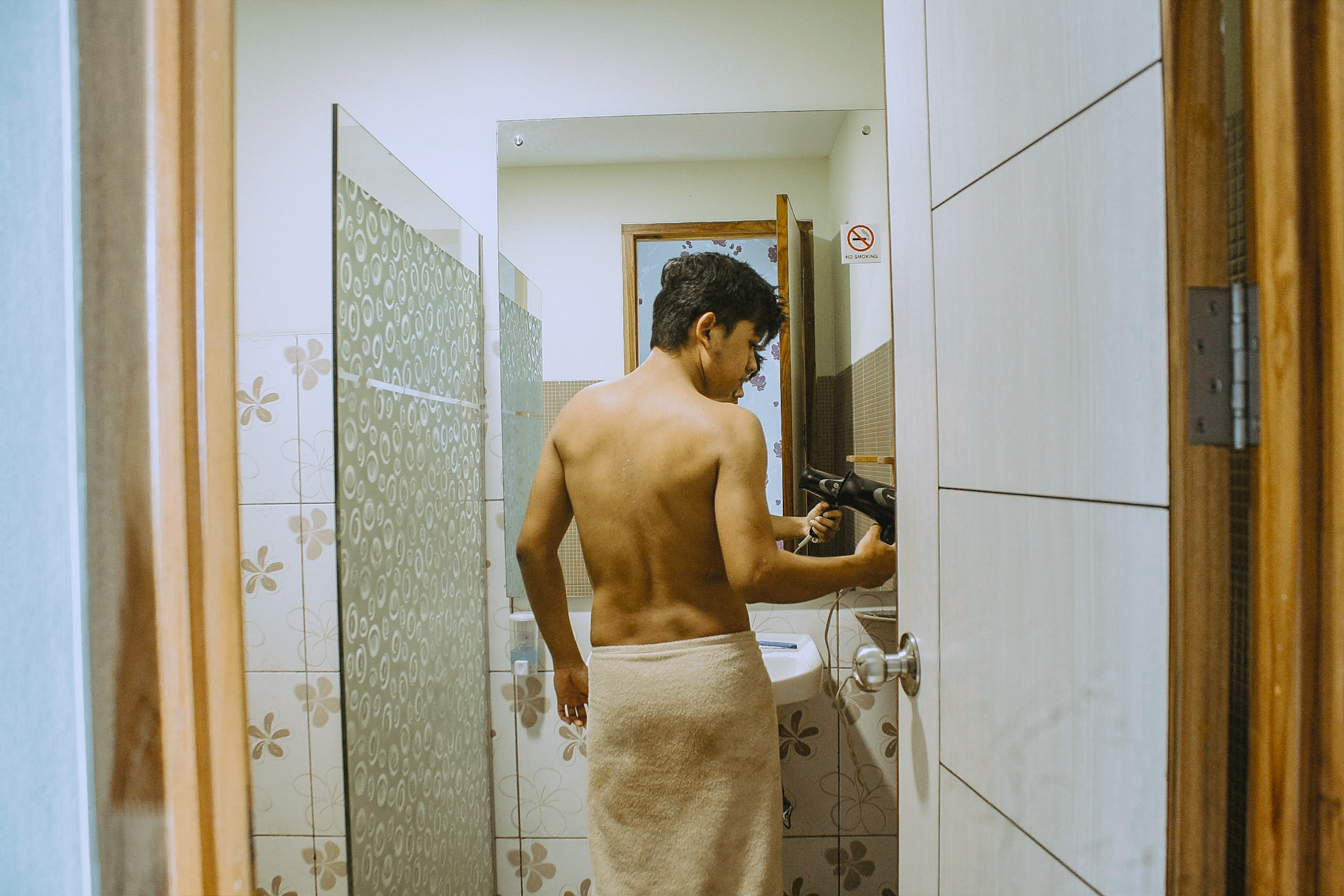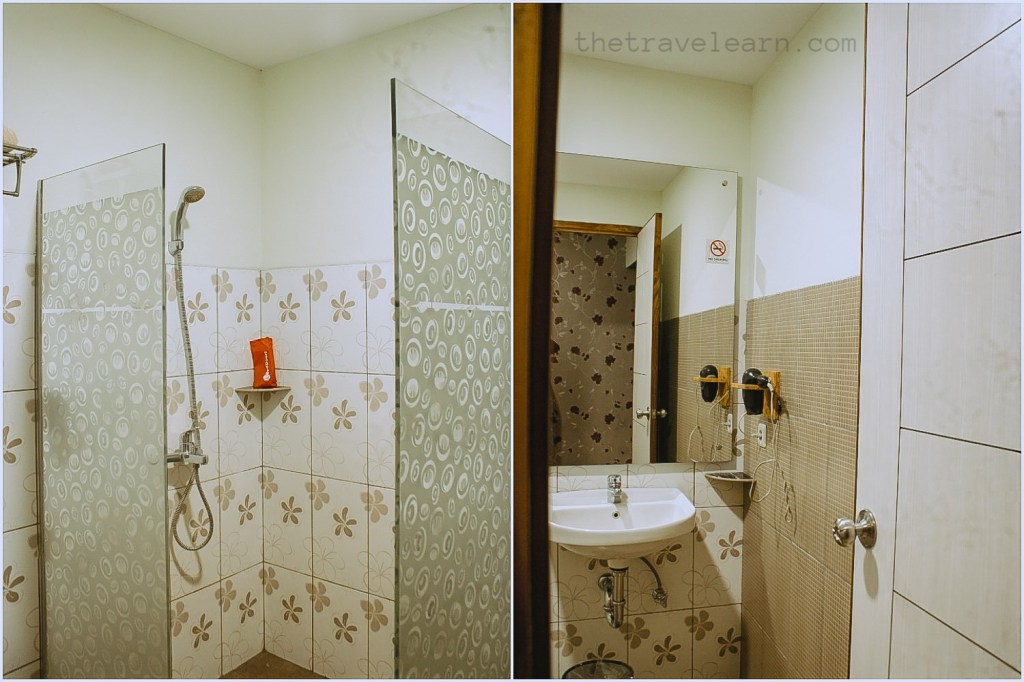 Area kamar mandi juga lega dengan shower air panas yang berfungsi baik. Area basah dan area kering (wastafel) dipisahkan oleh sekat kaca. Ada hair-dryer di area kering, tapi gue nggak tau berfungsi apa enggak karena nggak cobain. Paket toiletries RedDoorz tersedia di kamar mandi.