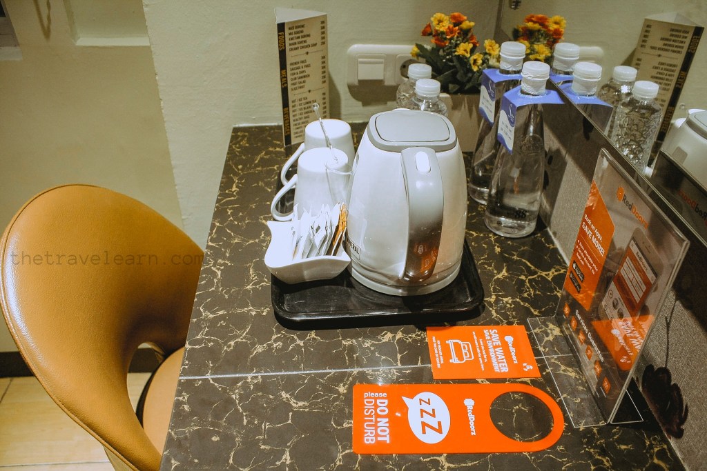 Bagian utama kamar diisi dengan sepasang twin bed (padahal gue sendirian), working area, dan coffee & tea maker. Pertama kalinya nih gue menemukan kehadiran fasilitas coffee & tea maker di RedDoorz. Jadi ini bedanya RedDoorz biasa dengan RedDoorz Premium. Masing-masing 2 botol air minum gratis dan yang berbayar sudah tersedia.