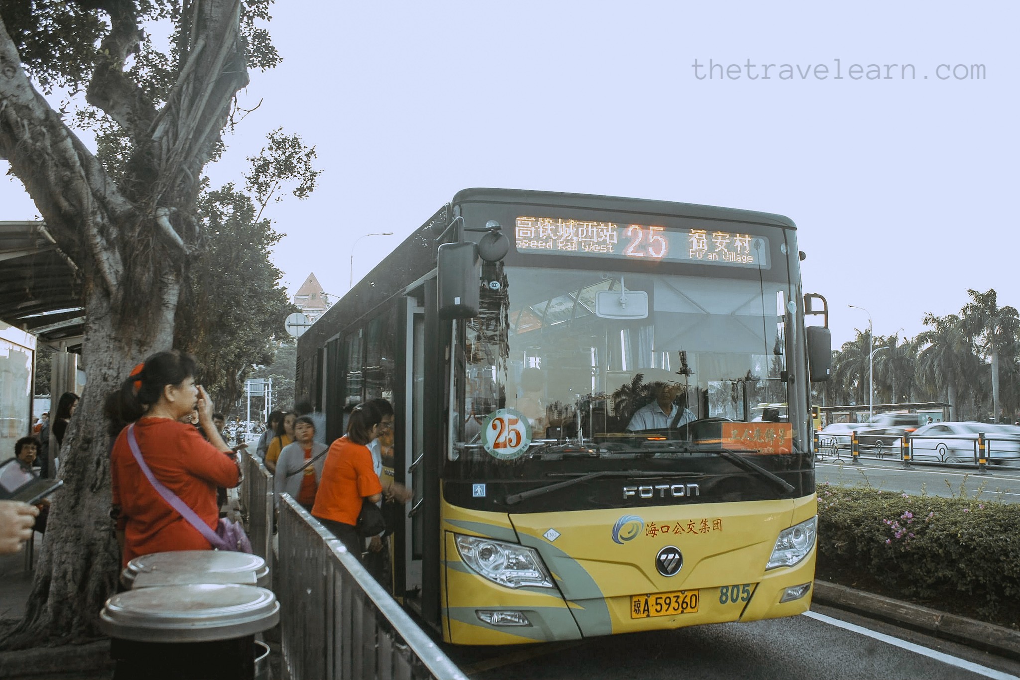 Belum ada metro atau MRT di Hainan, bus kota masih menjadi andalan transportasi umum di Haikou dan Sanya. Jalurnya banyak, haltenya ada di mana-mana, busnya sudah ber-AC. Ada informasi jalur bus dengan masing-masing pemberhentiannya di halte, sayangnya informasi ini ditulis dengan aksara kanji.