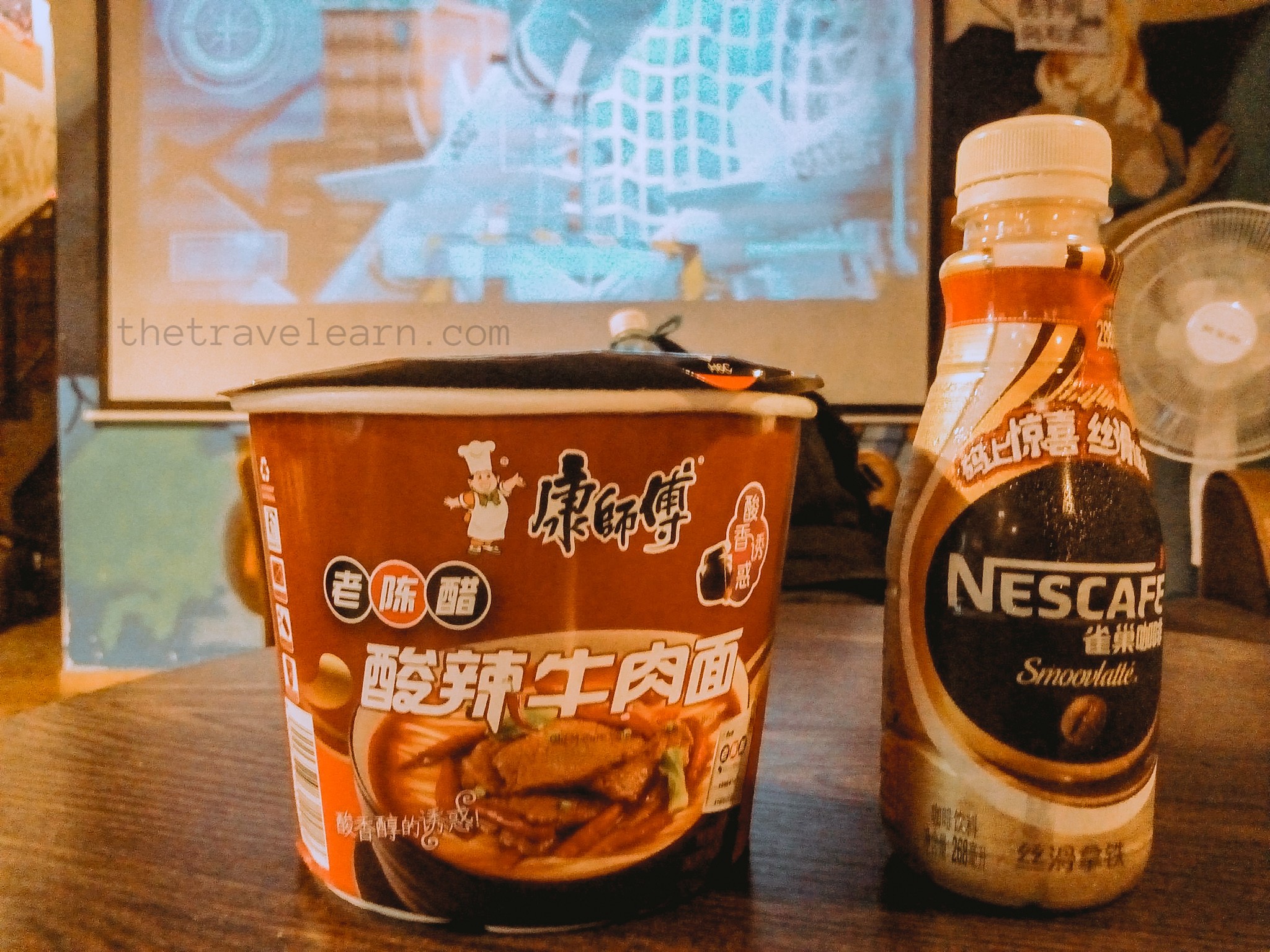 Makan adalah hal yang cukup menantang di Hainan karena semua informasi ditulis dalam aksara kanji. Makanya gue sering makan di pastry sama fast food restaurant karena gampang buat pesen, tinggal tunjuk-tunjuk. Pastry di hari 2 sama hari 3 itu beda ya, kebetulan aja total harganya sama-sama 9 CNY. Harga segitu bisa dapet 2 macam roti. Di hari keempat malam, harga 17 CNY itu udah mencakup cup noodle berukuran besar, roti, dan air mineral 600 ml. Cuma karena nggak ada struk belanja, gue juga jadi nggak tau rincian harganya. Harga air mineral di Hainan berkisar di 2-3 CNY buat kemasan 600 ml.