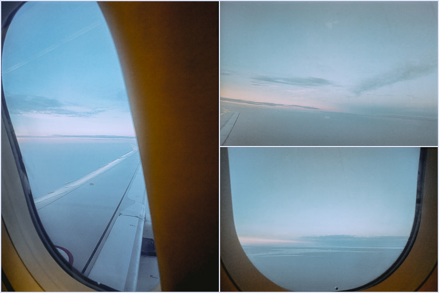Gue melakukan tindakan yang tepat dengan memilih kursi samping jendela di sisi kiri. Karena ini adalah penerbangan pagi jam 6:25, maka sesaat setelah badan pesawat terangkat ke angkasa, gue dihadapkan dengan semburat kemerahan yang tergores di garis cakrawala. Gradasi warna biru, toska, hingga jingga tampil memanjakan mata, seperti menjadi hadiah untuk pemuda itu yang letih karena drama.
