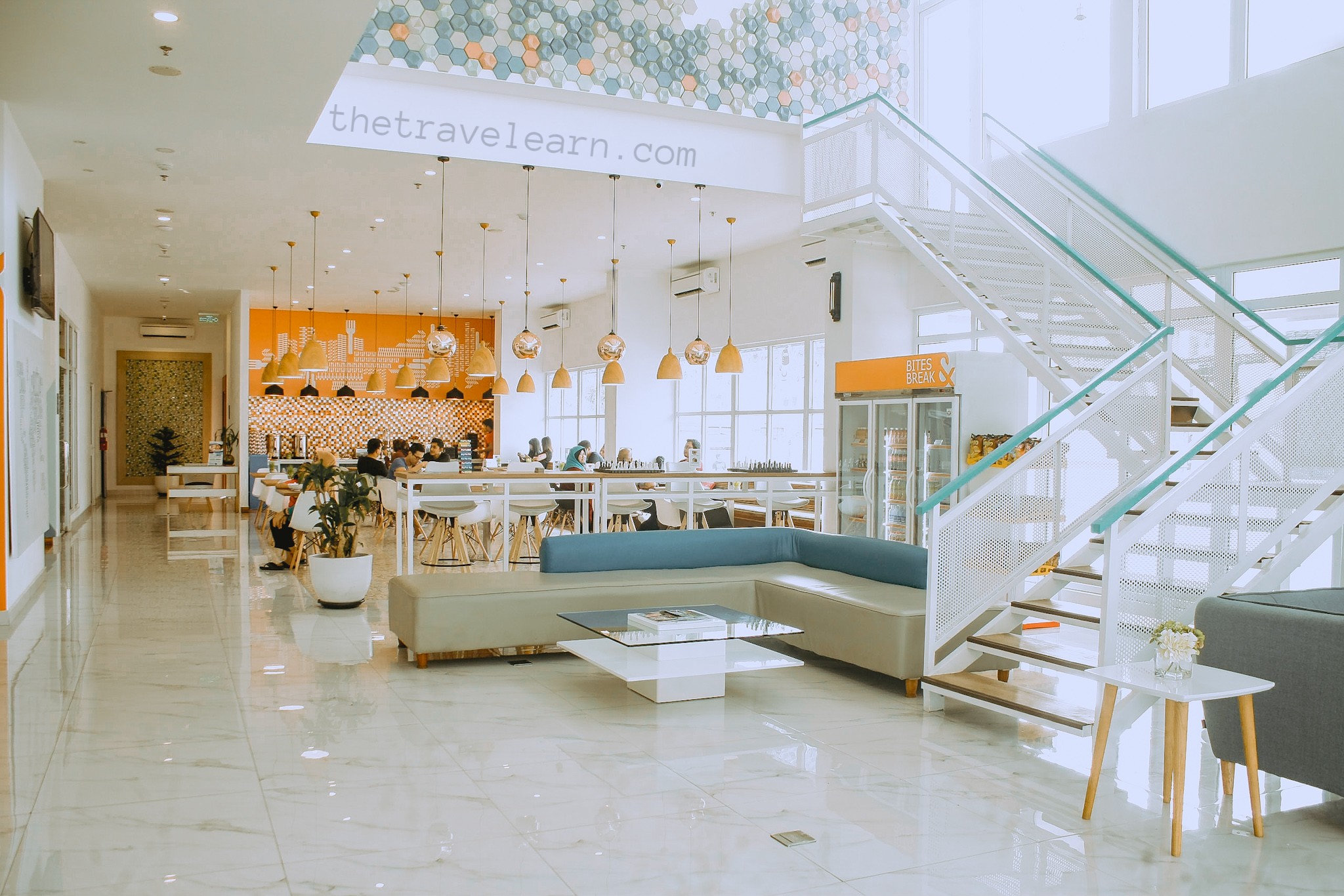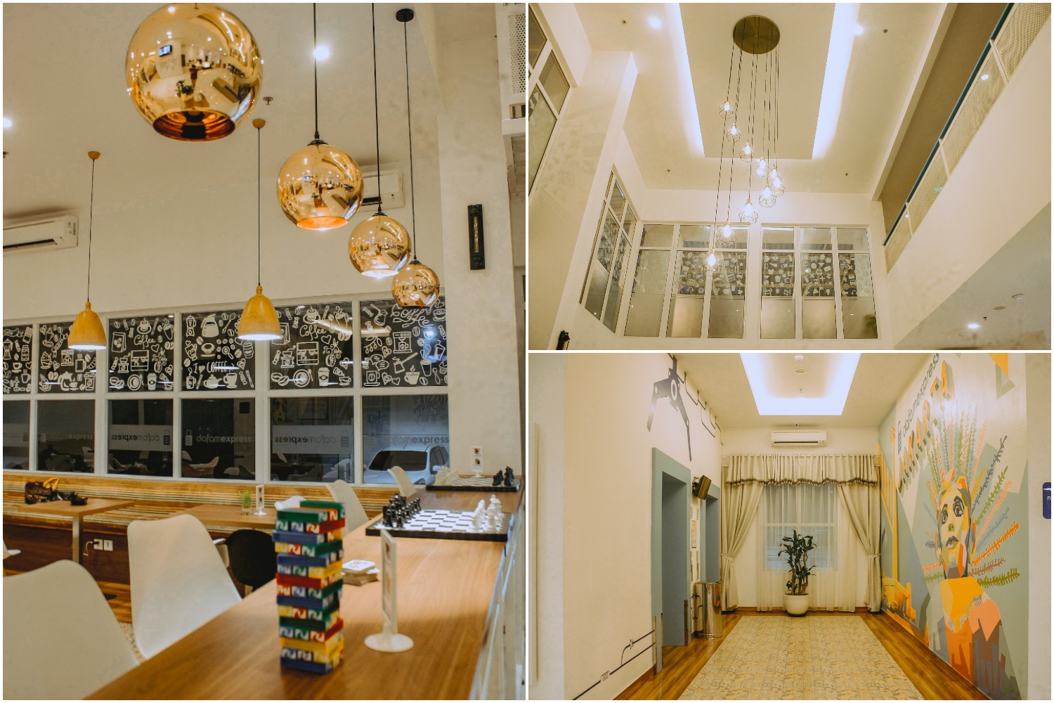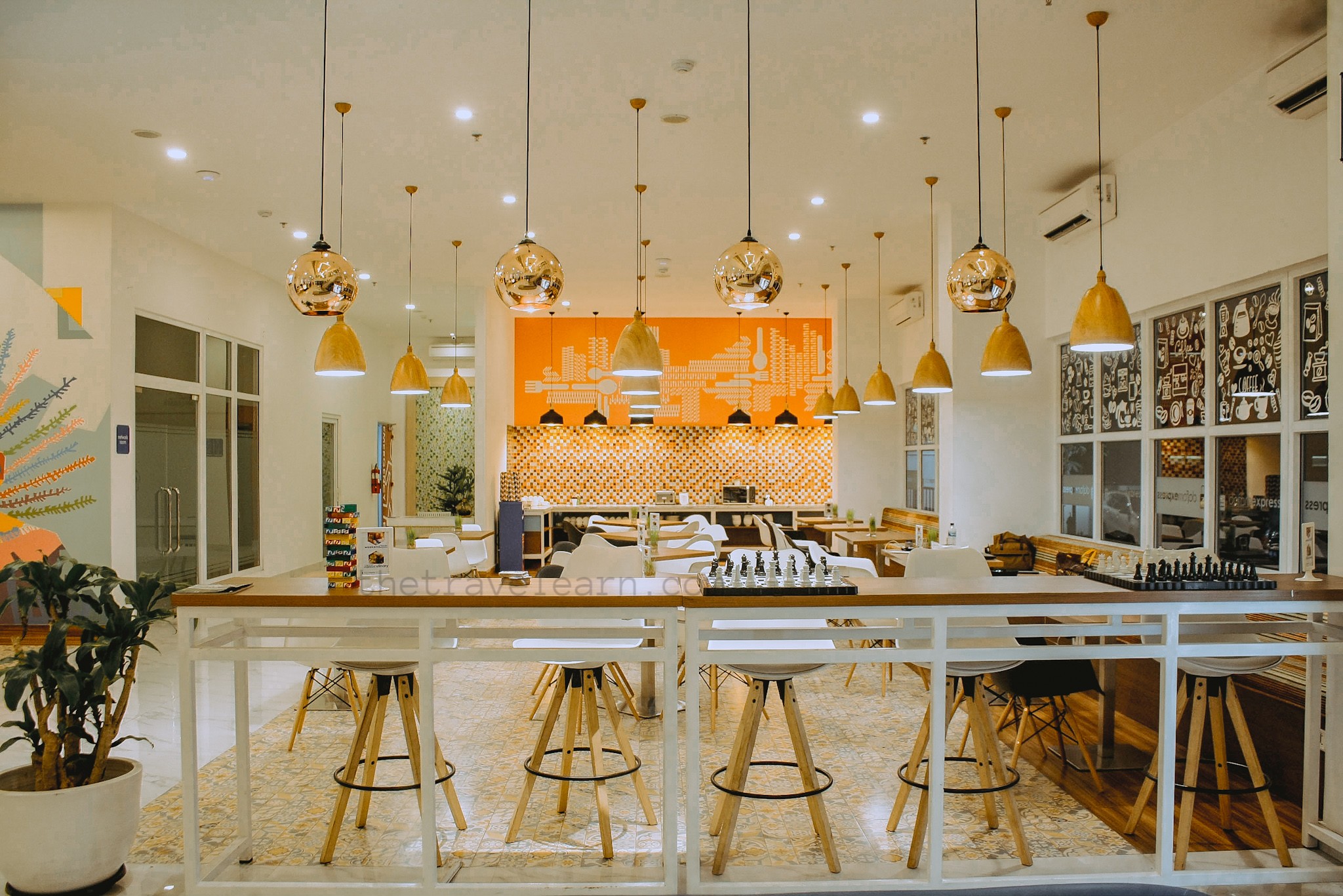 Lobi dan ruang makan ini bisa disatukan sebagai communal room atau area bersama. Pagi hingga siang, ruangan terkesan terang, sehat, dan segar berkat sirkulasi cahaya alaminya. Selalu suka sama ruangan dengan konsep seperti ini. Namun saat malam, ruangan terlihat elegan berkat ornamen lampu-lampu gantung yang dipilihnya. Dinding ruangan tak dibiarkan kosong, diisi dengan wall-art yang menarik mata dan apik dijadikan latar berfoto. Sebagian di antaranya kental dengan nuansa Betawi, what a fun and creative way to introduce the local culture to guests!