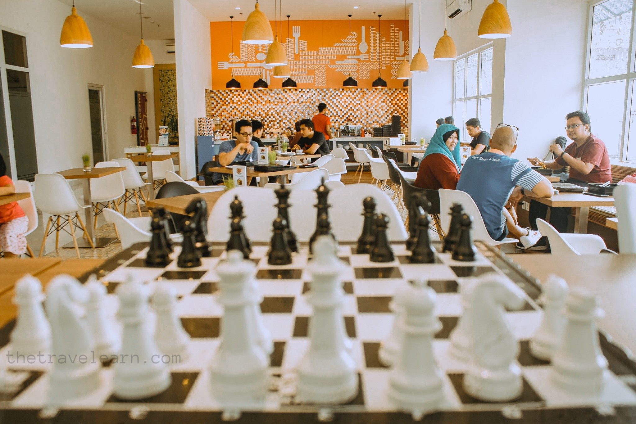 Lobi Dafam Express Jaksa dilengkapi dengan meja resepsionis, area duduk berupa sofa, express check-in machine (yang sayangnya nggak gue coba), konter makanan, dan tangga menuju ruang meeting di lantai 2. Untuk akses ke kamar, tamu bisa menggunakan elevator (lift). Area penerimaan tamu dan area ruang makan “disekat” oleh sebuah meja panjang dengan kursi-kursi bar. Di atas meja, sudah terdapat alat bermain catur dan uno stacko.