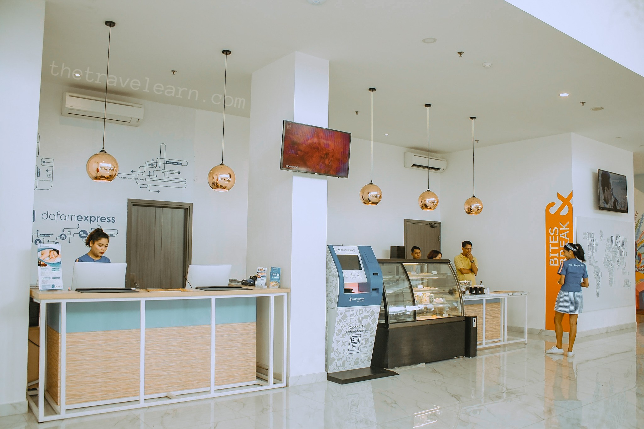 Meja resepsionis, mesin check-in express, dan konter makanan Dafam Express Jaksa