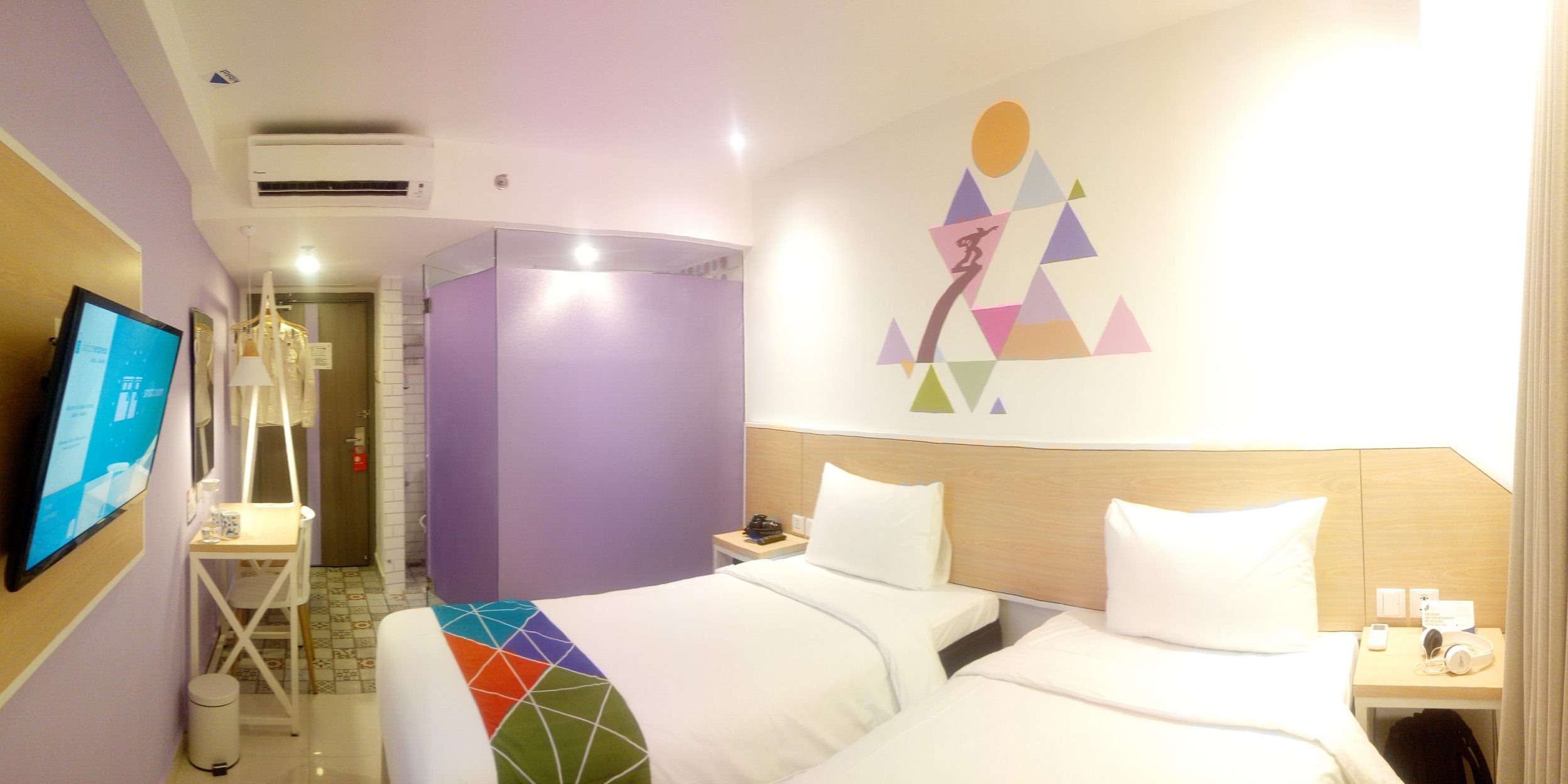 Uniknya, Dafam Express Jaksa menyajikan nuansa warna yang berbeda-beda untuk tiap kamarnya setiap 2 lantai. Kamar gue contohnya, diguyur dengan warna ungu yang anggun. Dinding kamar pun dihidupkan dengan wall art bernuansa Jakarta, seperti Patung Pancoran yang ada di kamar gue. Karena lokasinya juga tinggi, dari jendela kamar gue bisa menikmati panorama gedung-gedung pencakar langit Jakarta Pusat.