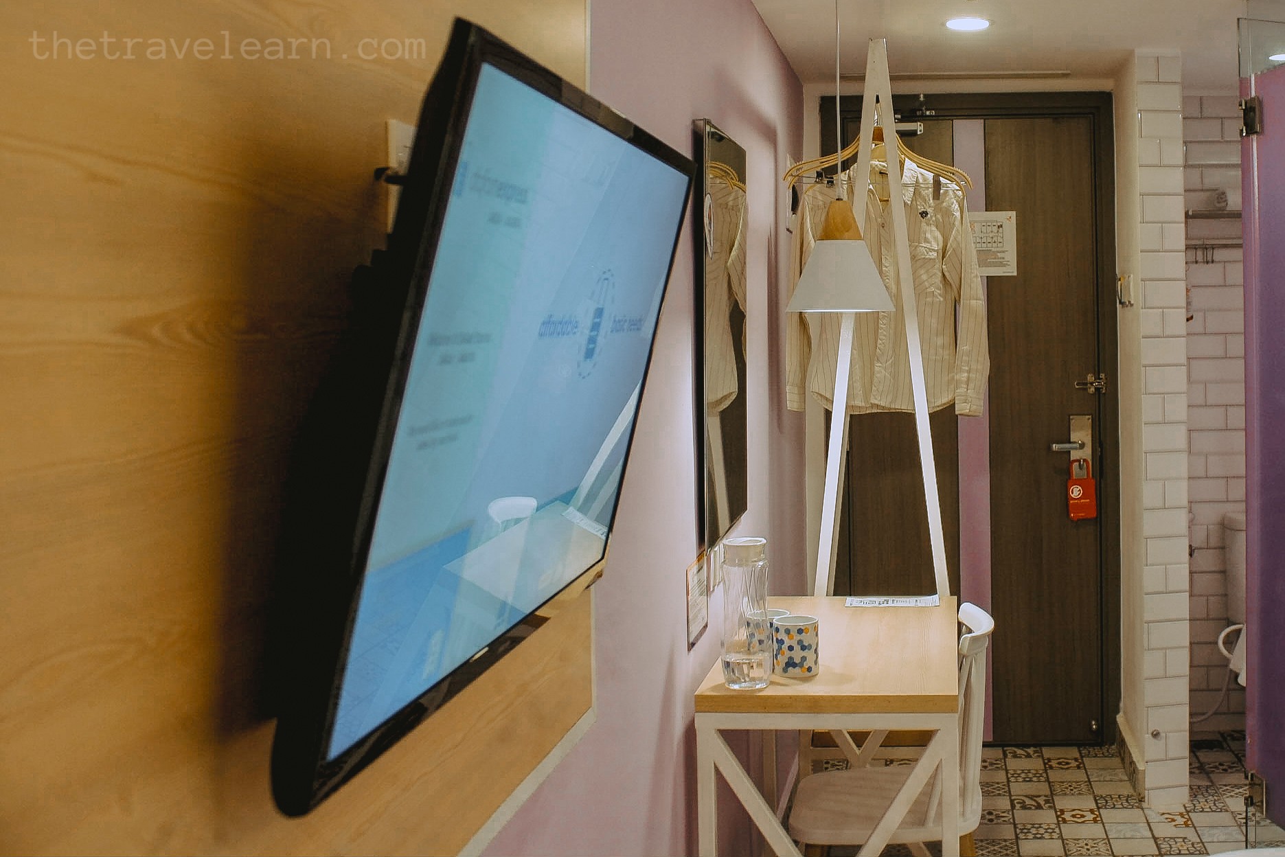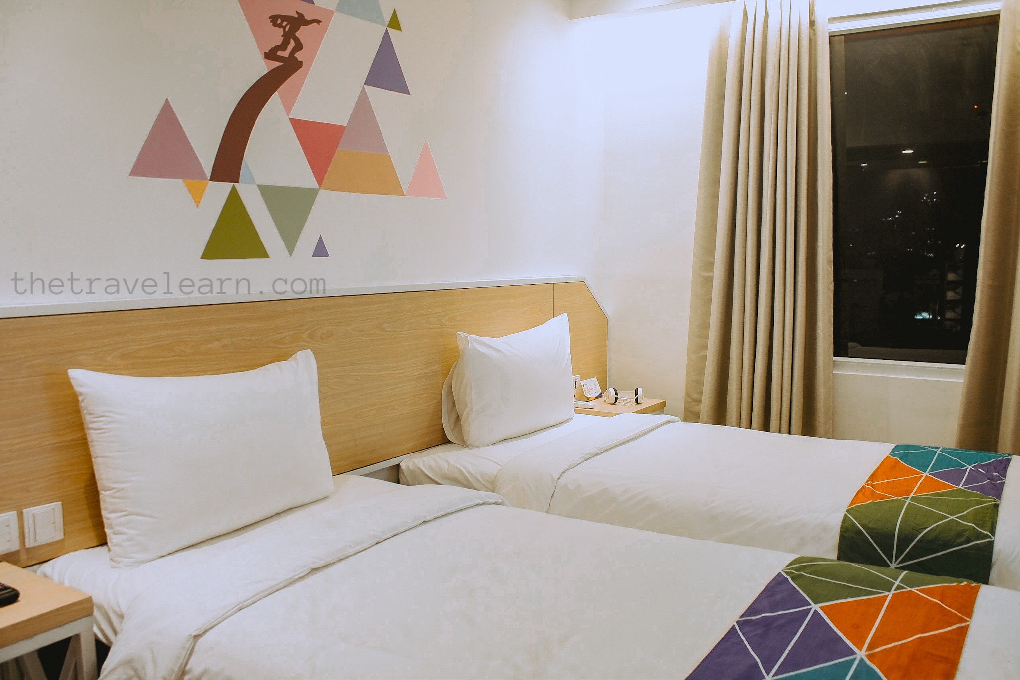 termasuk cukup luas juga kamarnya,paduan warna warna neonnya kayaknya bisa bikin hari dikamar ceria aja kalo seharian ikut walking tour.