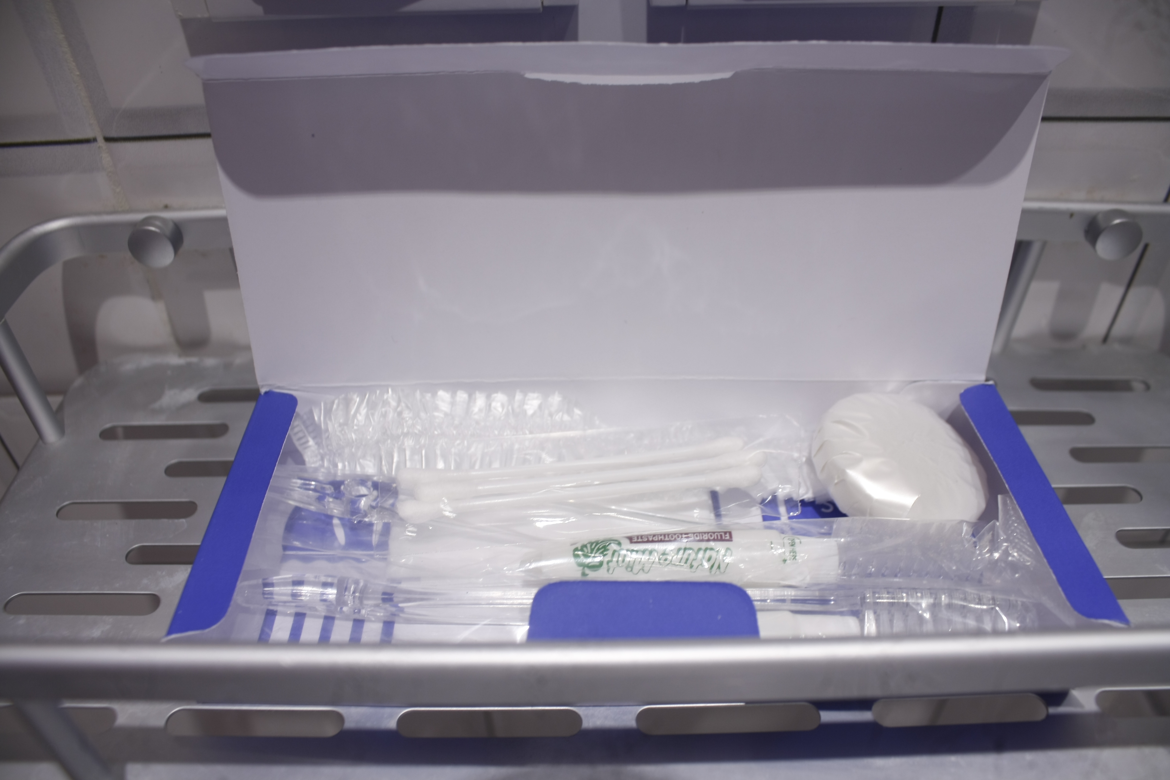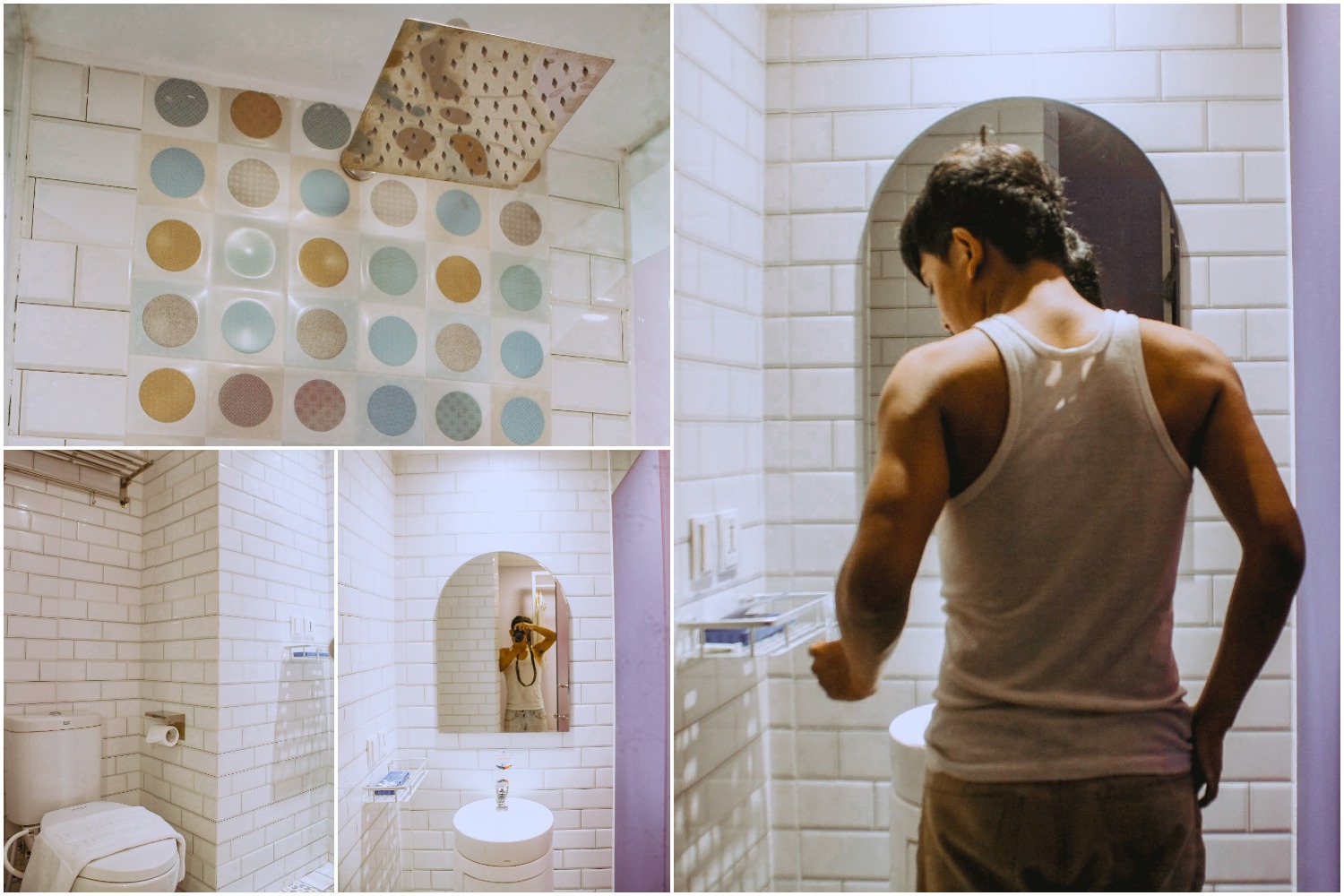 Yang beyond expectation adalah kamar mandinya. Luas, dengan dinding masif yang dilapisi tile nan elegan, bukan kamar mandi kapsul seperti hotel bintang 2 lainnya. Area basah dan area kering dipisahkan oleh sekat kaca. Paket toiletries yang tersedia adalah sabun bar, odol, sikat gigi, shower cap, dan cotton bud. Yang gue suka lagi adalah tipe shower-nya. Bukan shower biasa, namun sudah seperti rainforest shower.