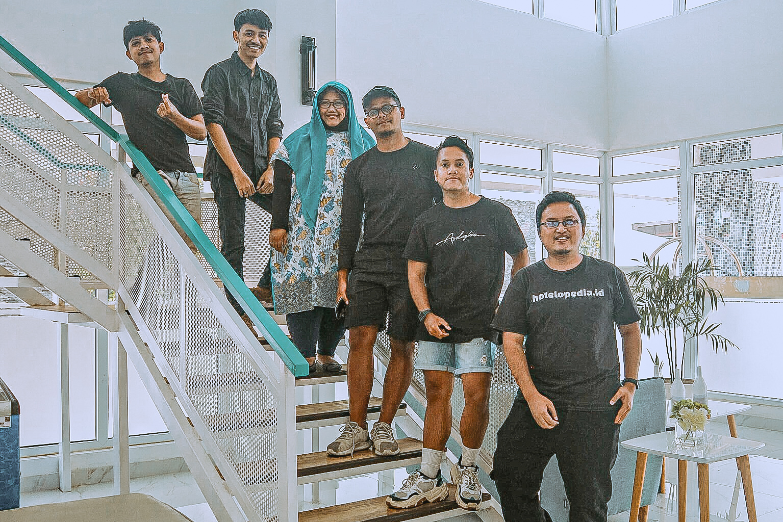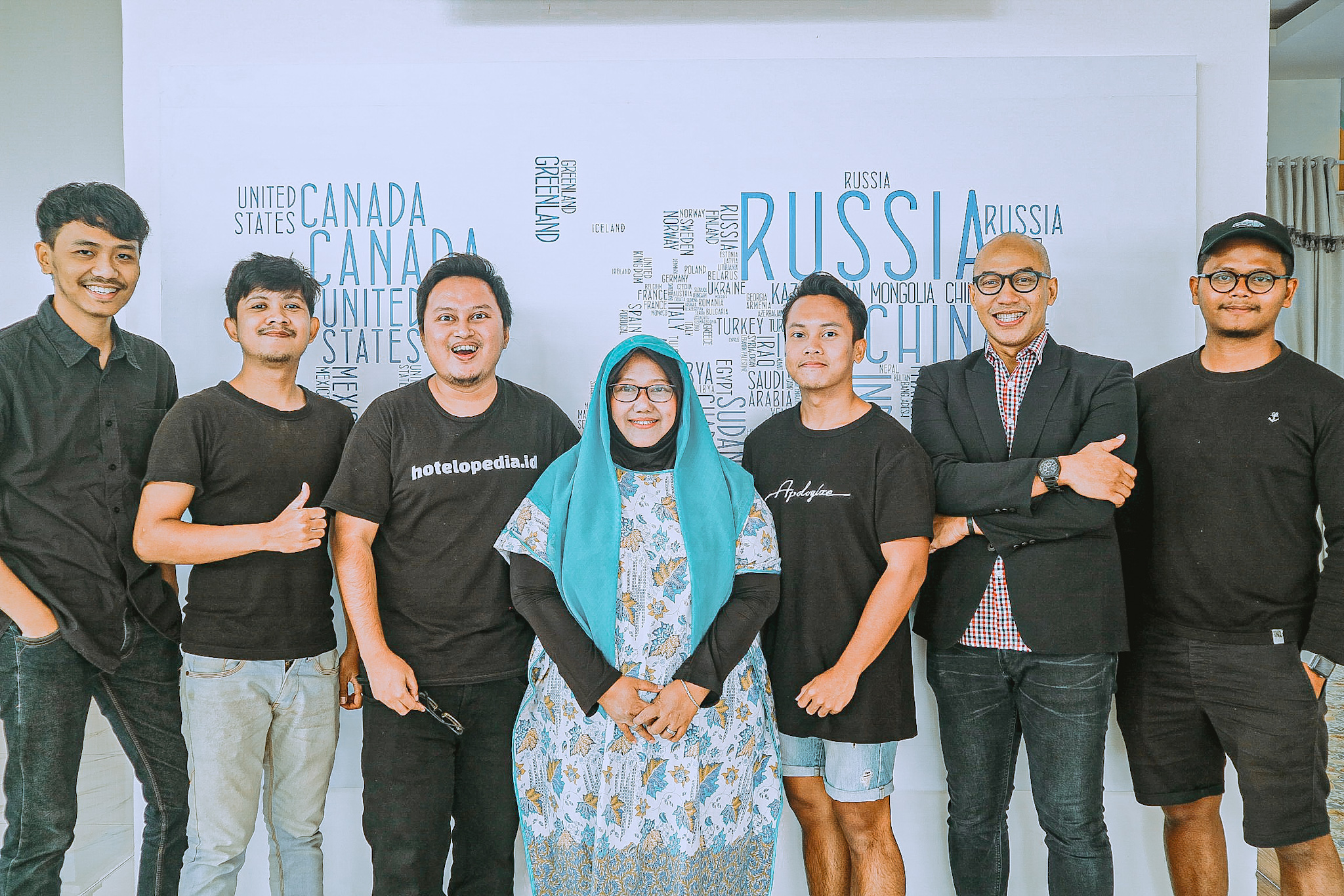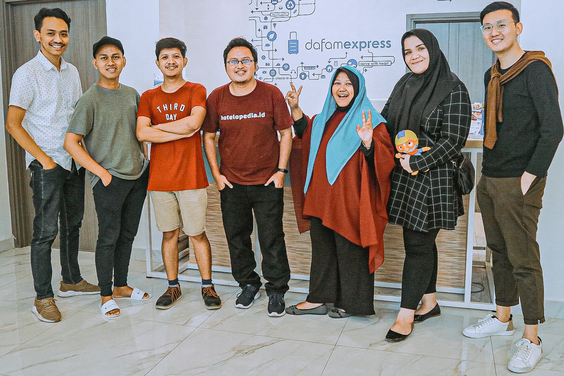 Teman Hotel Reviewer (+ kang Indra, kanan) berfoto di lobi Dafam Express Jaksa