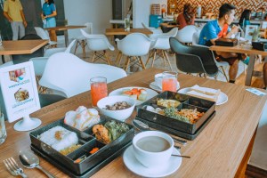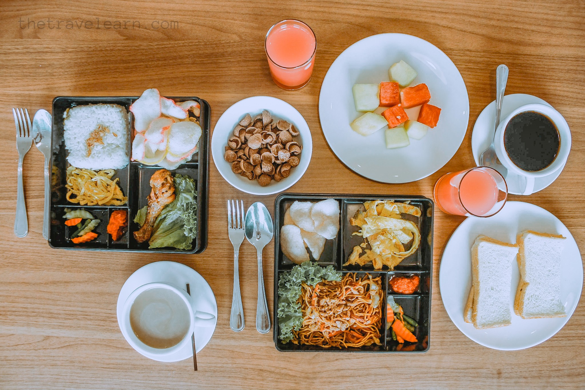 Sarapan di Dafam Express Jaksa memadukan konsep a la carte dan buffet breakfast. Tamu menikmati bento box pilihannya sekaligus memilih menu lain yang tersedia secara prasmanan. Dari jauh, gue kira itu kotak frozen food berbahan plastik sekali pakai seperti yang gue temukan di POP! Hotel Pasar Baru. Hampir aja gue nyinyir, tapi ternyata enggak. Kotak makannya dari kayu kok, dan digunakan seterusnya.