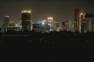 Panorama malam hari gedung-gedung perkantoran dari rooftop Pomelotel Jakarta Selatan