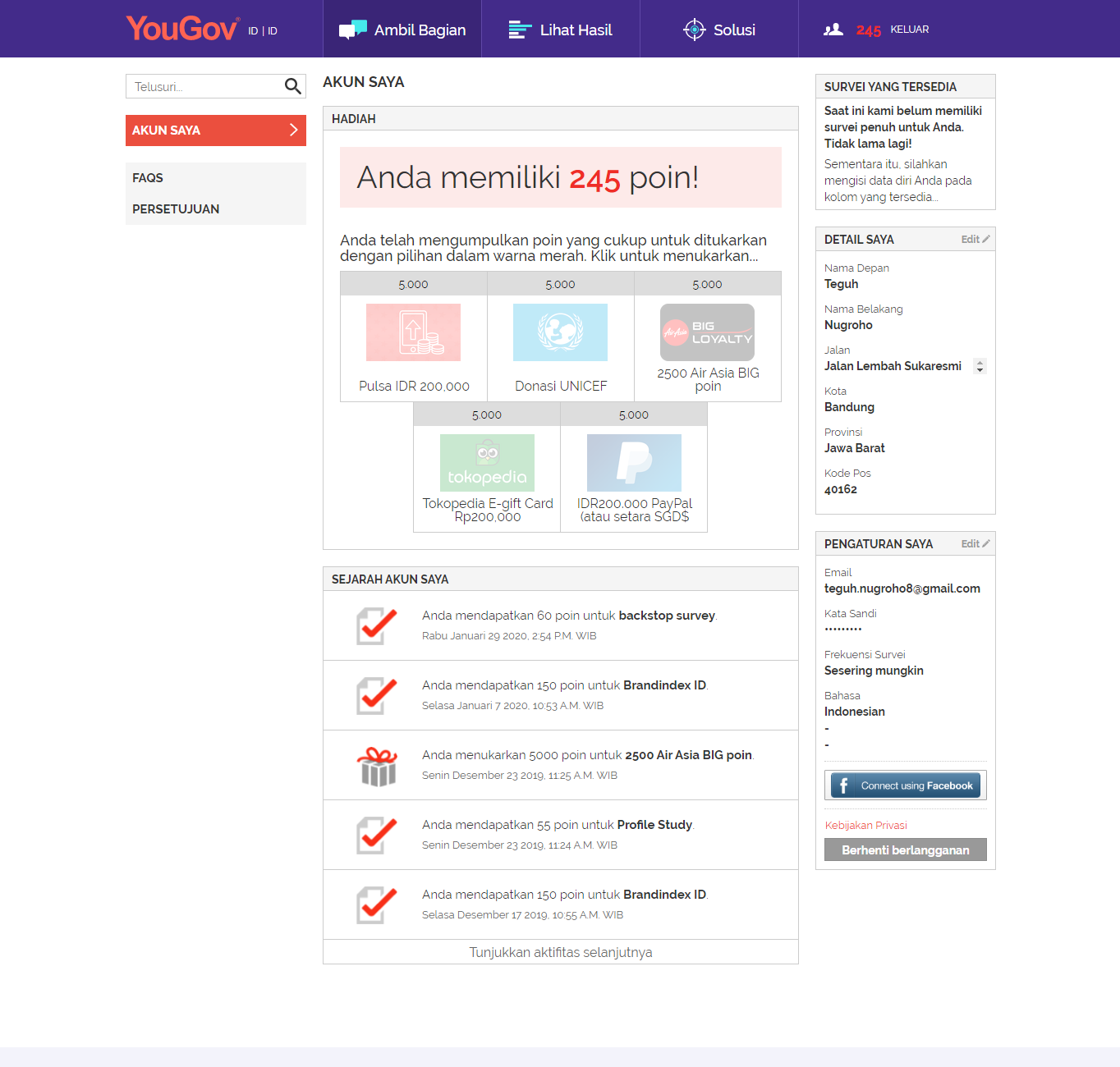 Gue lupa gimana caranya gue jadi anggota YouGov. Pokoknya, kamu segera daftar jadi anggota deh, terus hubungkan akun YouGov kamu sama akun airasiabig kamu.