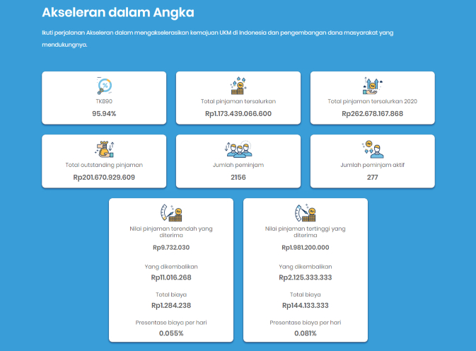 Sebagai P2P Lending Platform di Indonesia, Akseleran menghubungkan UMKM yang membutuhkan dana untuk mengembangkan atau mempertahankan usaha dengan para pemberi pinjaman. Suku bunganya kompetitif dengan tenor, metode pembayaran, dan penyertaan agunan yang fleksibel.
