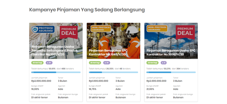 Pada website ataupun aplikasi, klik “Beri Pinjaman”. Di halaman ini muncul kampanye pinjaman yang sedang berlangsung. Ada banyak kategori UKM yang bisa dipilih, diantaranya: hiburan, fashion, transportasi, e-commerce, otomotif, dan sebagainya.
