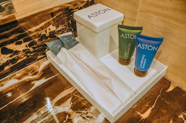 Dua keunggulan dari kamar mandi di hotel ASTON Pasteur: luas dan dibalut material marmer/pualam yang menghadirkan kesan mewah dan elegan. Kamar mandi dilengkapi dengan sabun cair, sabun bar, shampoo, peralatan menggosok gigi, gelas berkumur, dan hair dryer. Area basah dan area kering dibatasi dengan sekat kaca. Lighting-nya juga bagus, cakep buat foto-foto hehe.