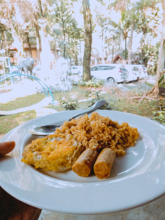 Nah, pagi pertama sarapannya nasi kuning. Paket sarapan ini dibawakan oleh petugas hotel, lengkap dengan telur balado, orek tempe, bihun goreng, bakwan, buah, dan jus. Walaupun sederhana, tapi cukup mengenyangkan. Kami minta makanan dibawakan ke gazebo biar suasananya lebih asyik. Besoknya, sarapannya nasi goreng, disajikan dengan telur ceplok dan sosis. Kalau yang ini kami nikmati di communal room.