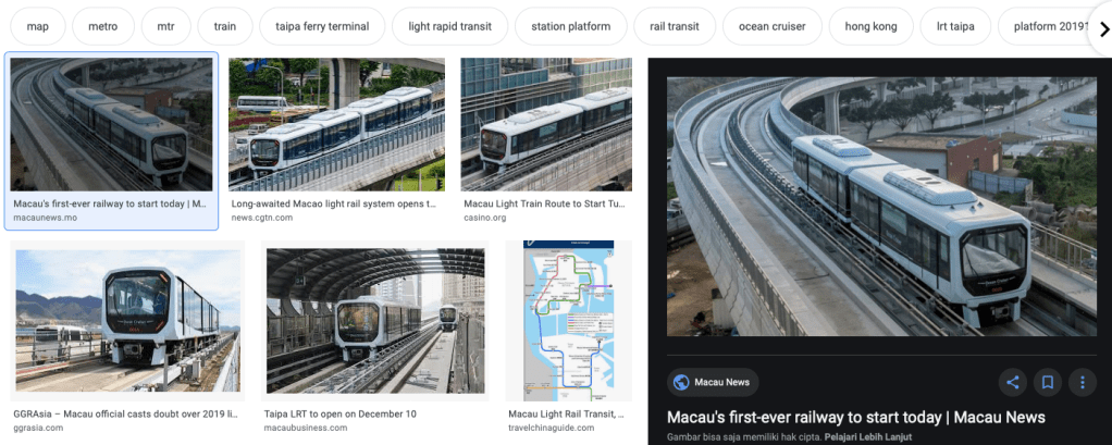 Macau LRT mulai beroperasi pada 10 Desember 2019. Saat ini baru ada 1 jalur sepanjang 9.3 kilometer dengan 11 stasiun, menghubungkan Taipa Ferry Terminal (Terminal Maritimo de Taipa) hingga Ocean, melalui Aeroporto (bandara Macau). Keretanya driverless alias tanpa pengemudi, 1 rangkaian terdiri dari 2 gerbong kereta. Gue harus cobain ini nih kalo ke Macau lagi hehe.