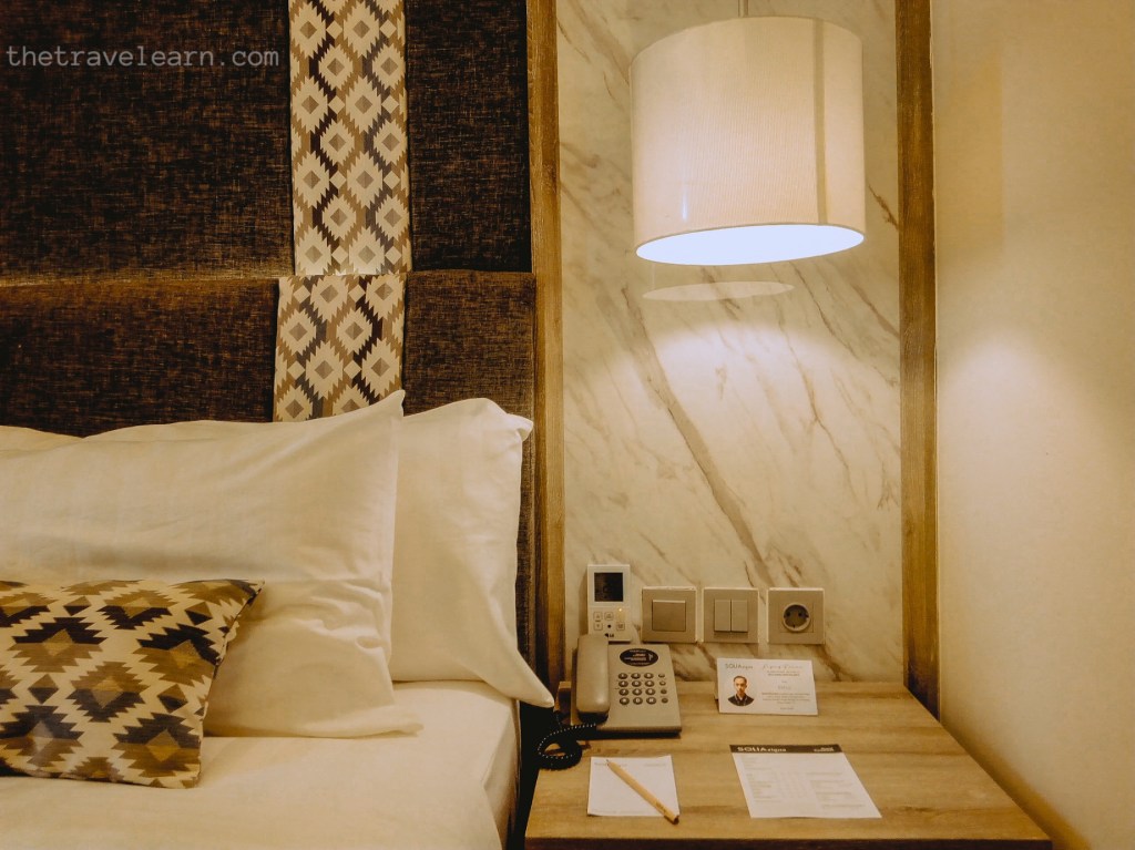 Terus aku juga suka dengan lantai parketnya karena membuat nyaman dan hangat di kaki. Ada banyak lighting juga di dalam kamar, bisa diatur apakah mau kondisi kamar yang terang benderang, redup, atau nyaris gelap gulita haha. Bantalnya masing-masing ada 2 buah, ditambah 1 bantal kecil. Colokan listrik pun ada di titik-titik strategis.