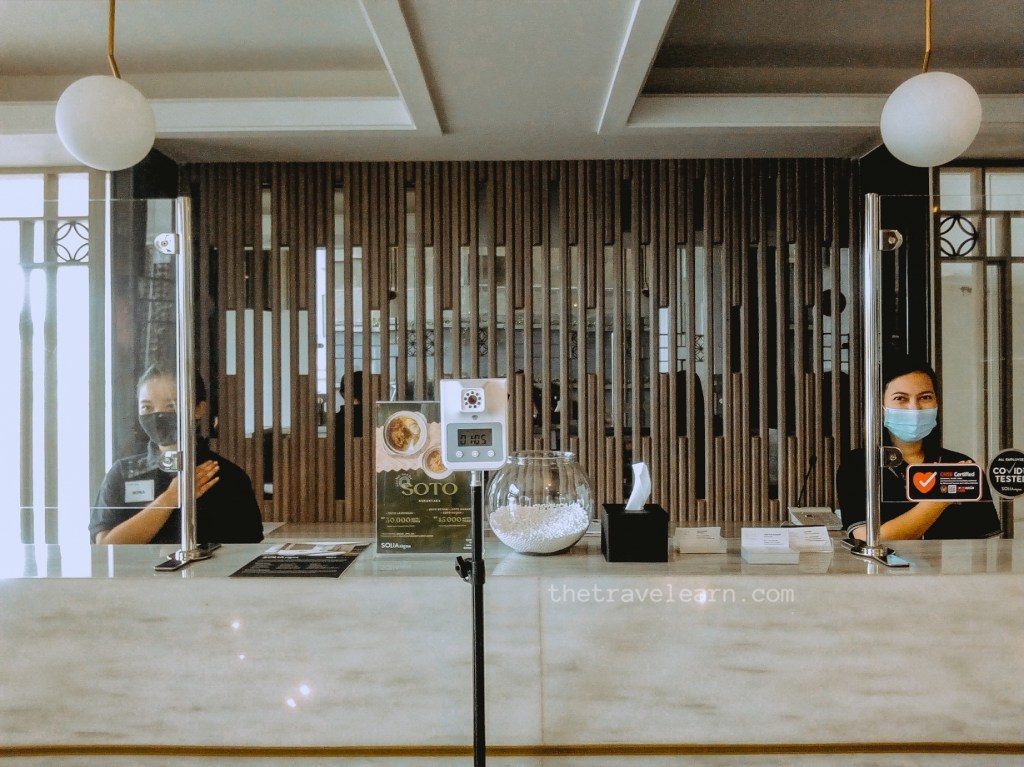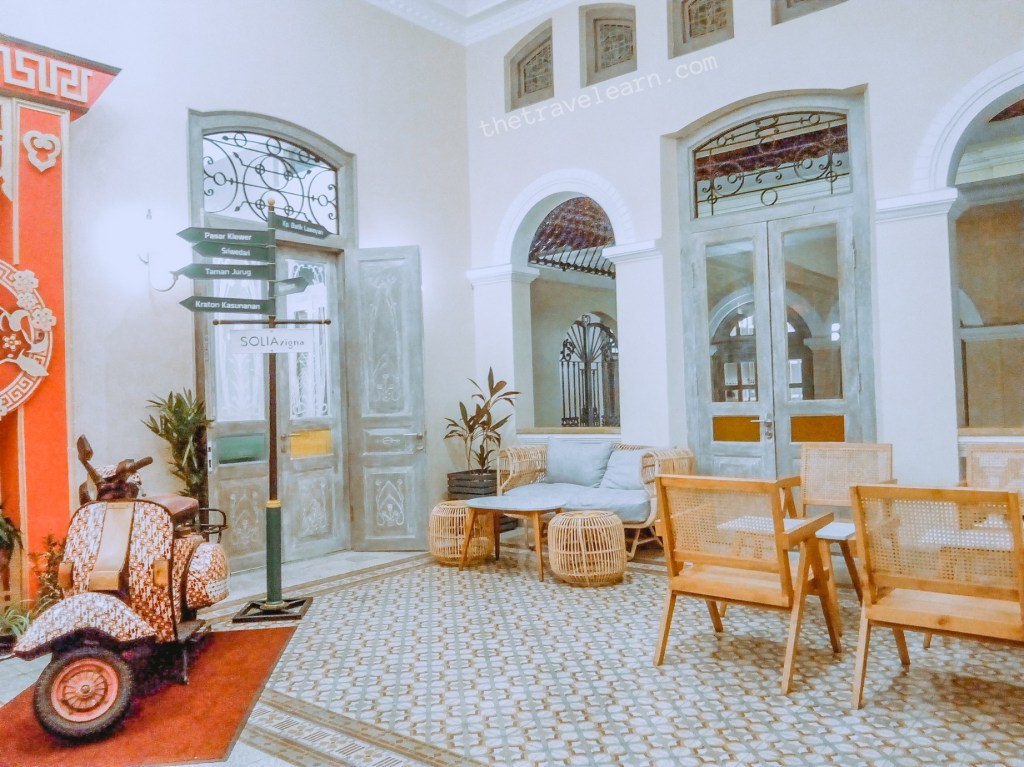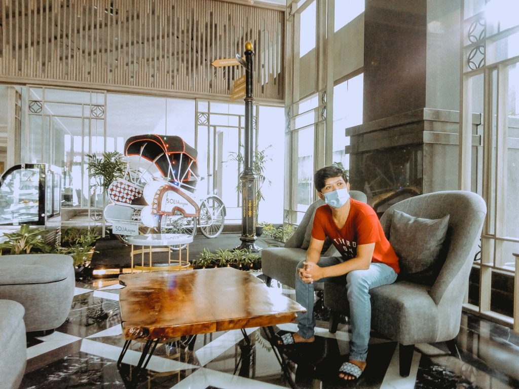 Sambil menunggu front desk officer melakukan pekerjaannya, aku menyapu pandang seluruh ruangan. Ada sofa-sofa dan kursi-kursi empuk sebagai area tunggu tamu, pojok surat kabar, dan spot berfoto dengan becak estetik. Tanda X ditempelkan di sela-sela sofa untuk menjaga pembatasan sosial di era pandemi. Di antara area lobi dan Sogan Lounge, ada konter cake & bakery. Di sisi lain, sepasang petugas yang sepertinya anak magang berdiri dengan siaga menjaga pintu kaca sebagai akses tamu dari Kampung Laweyan. Ah, jadi ada 2 akses untuk Hotel Solia Zigna ini.