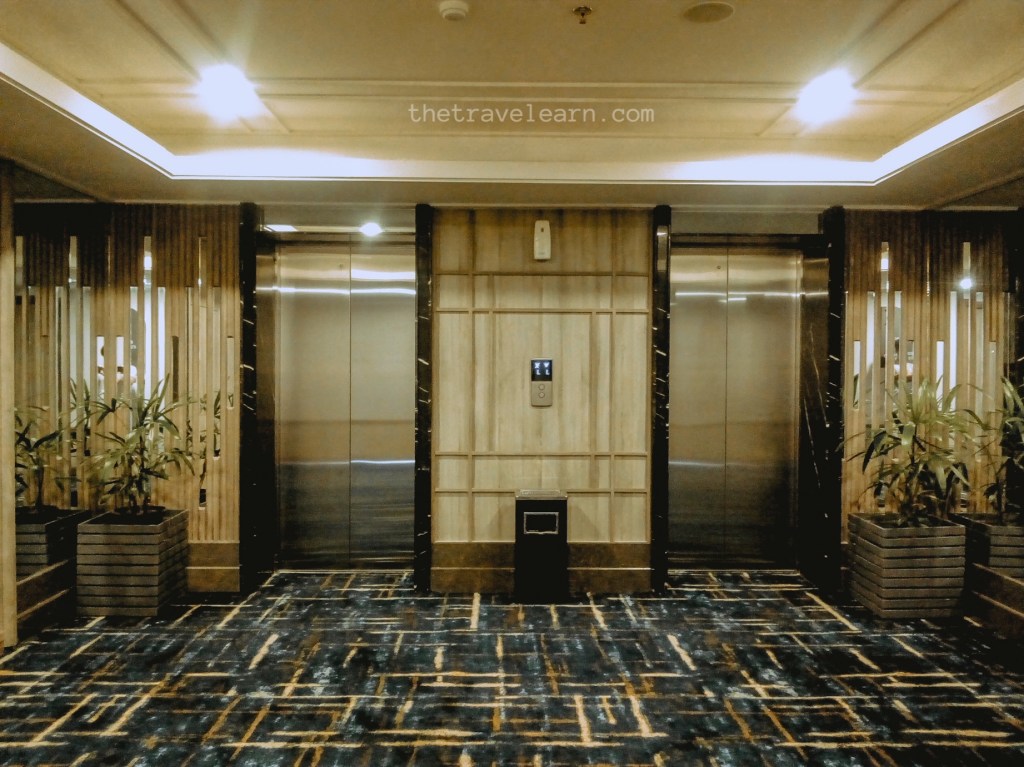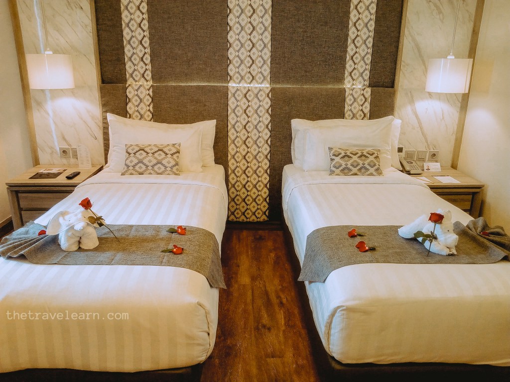 Senang rasanya bisa berjalan menghampiri kamar dengan suara langkah yang teredam karpet empuk. Area menunggu di depan elevator juga tampil apik dan mewah! Pintu kamar terbuka, dan… aku menyambut Deluxe Room yang akan menjadi tempatku bermalam hingga hari Senin lusa. Kamar terlihat nyaman dilihat dengan elemen kayu dan marmer pada beberapa bagian.