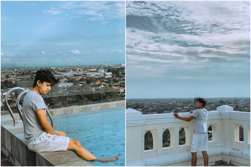 Solia Zigna Laweyan Solo punya rooftop yang asyik buat menikmati pemandangan kota dari ketinggian, apalagi saat sunset. Dari kolam renang, naik lagi melalui tangga penghubung. Saat cuaca cerah, anginnya kenceng banget sampai kaosku menggelembung-gelembung nggak kontrol 😁😁😁