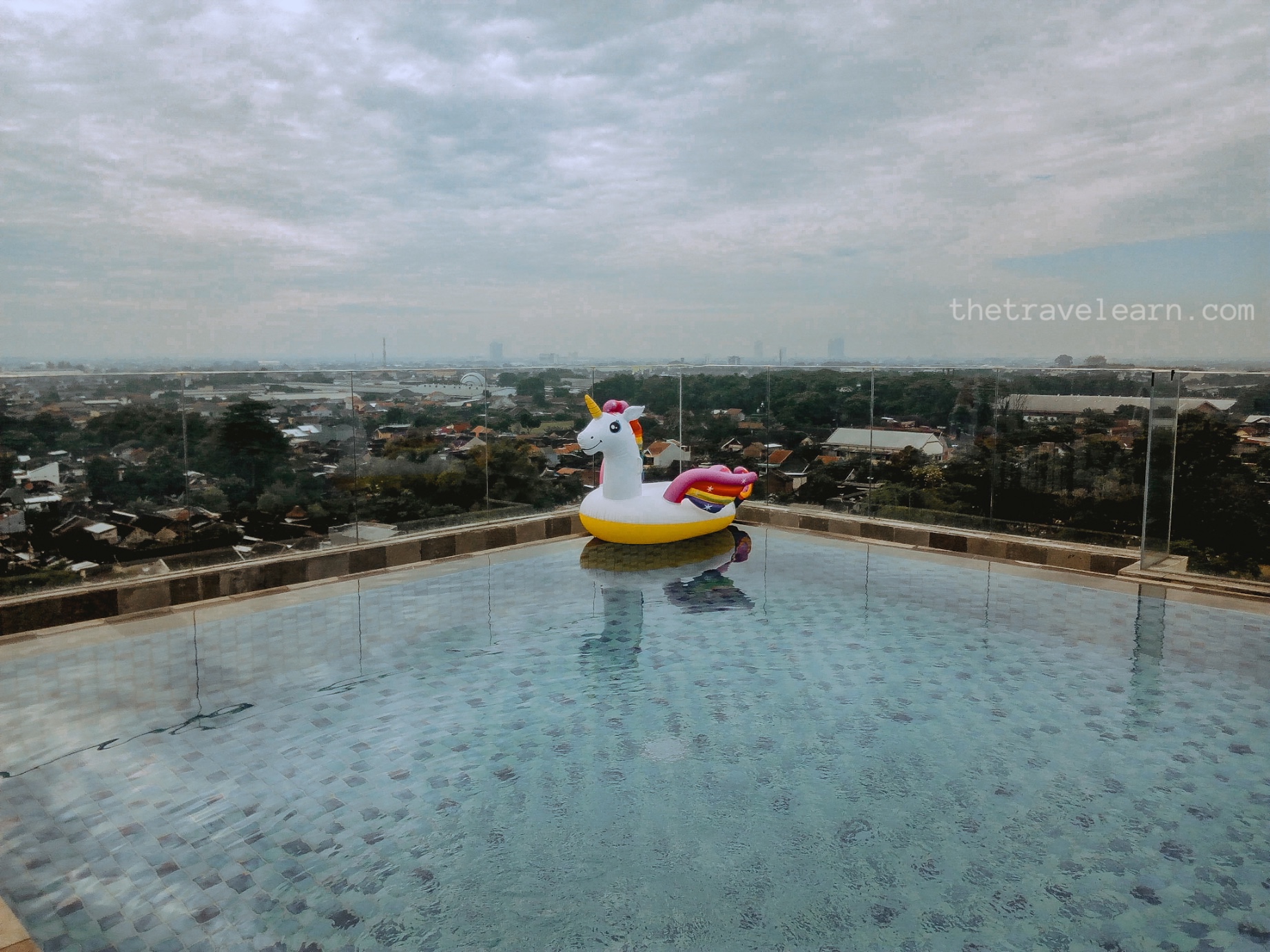Ada floaties unicorn juga lho. Sayangnya aku kelupaan meski sudah diinfokan mbak Dhara gara-gara floaties itu tak nampak saat aku berendam di kolam pada hari Sabtu sore. Besok paginya saat sarapan, baru ia muncul entah dari mana, terapung seorang diri di kolam renang.