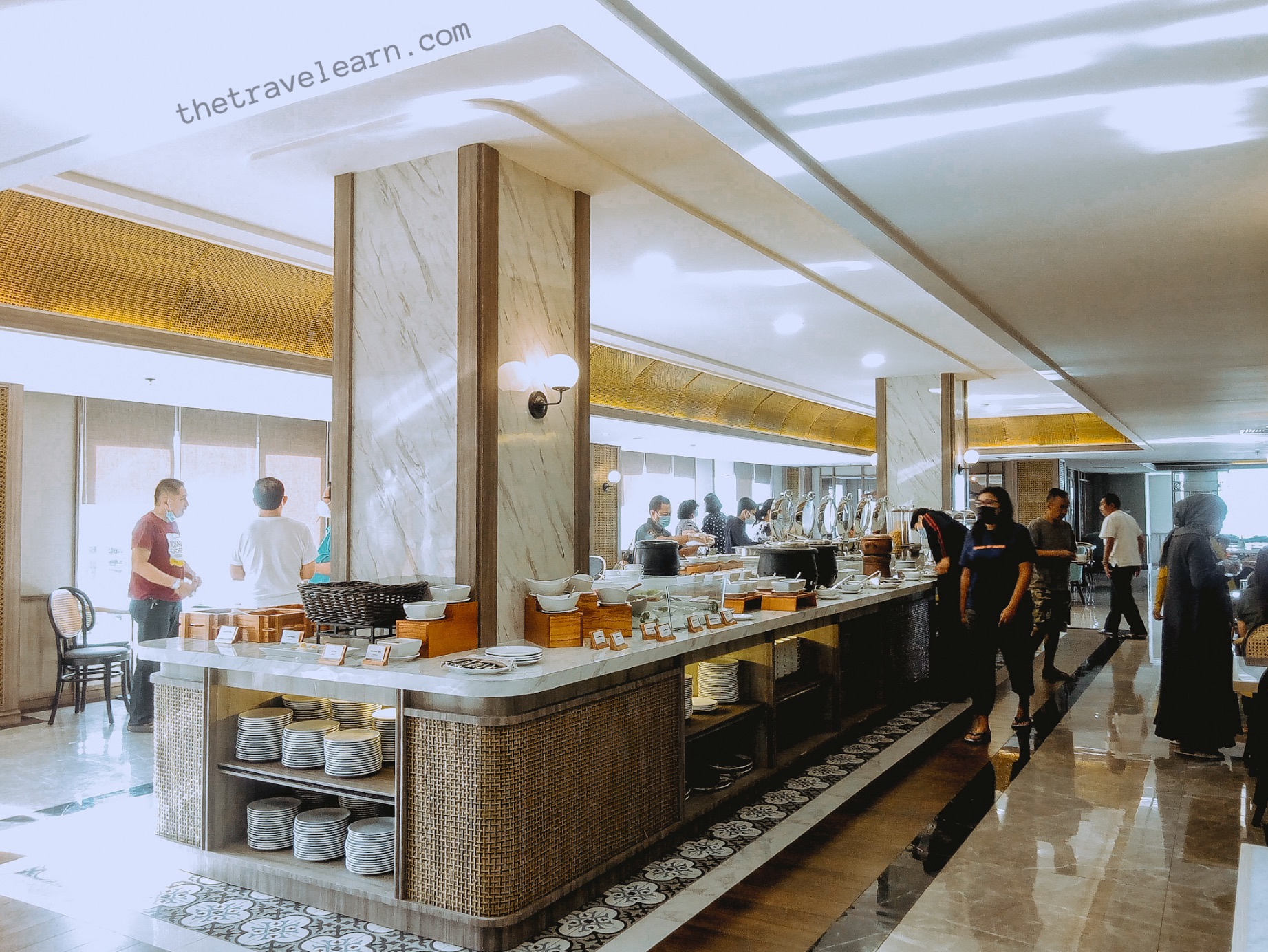 Area restorannya luas. Makanan disajikan dalam satu island utama dan satu konter omelet di sudut area bagian belakang. Di sekelilingnya ada kursi-kursi sofa berbalut warna toska yang segar, kontras dengan lantai yang bernuansa coklat dan lighting keemasan di langit-langit. Selain kursi sofa, juga ada kursi-kursi rotan dan kursi-kursi bar untuk kelompok besar.