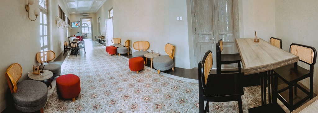 Masuk ke dalam bangunan, wah, aku semakin terpikat dengan interior ruangannya. Fitur yang paling menarik buatku adalah lampu-lampu gantung dan pintu-pintu lengkung, juga ornamen di atas setiap pintu dan jendela. Pemilihan langit-langit modern di langit-langit ruang utama juga cocok, nggak mengaburkan atmosfer klasik di bawahnya.