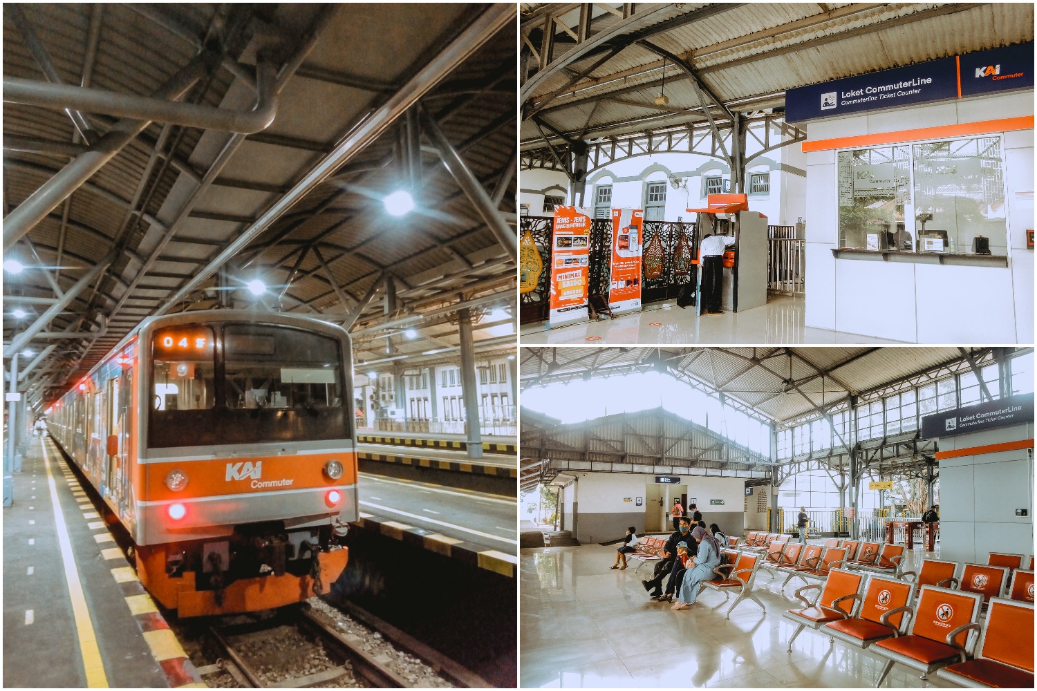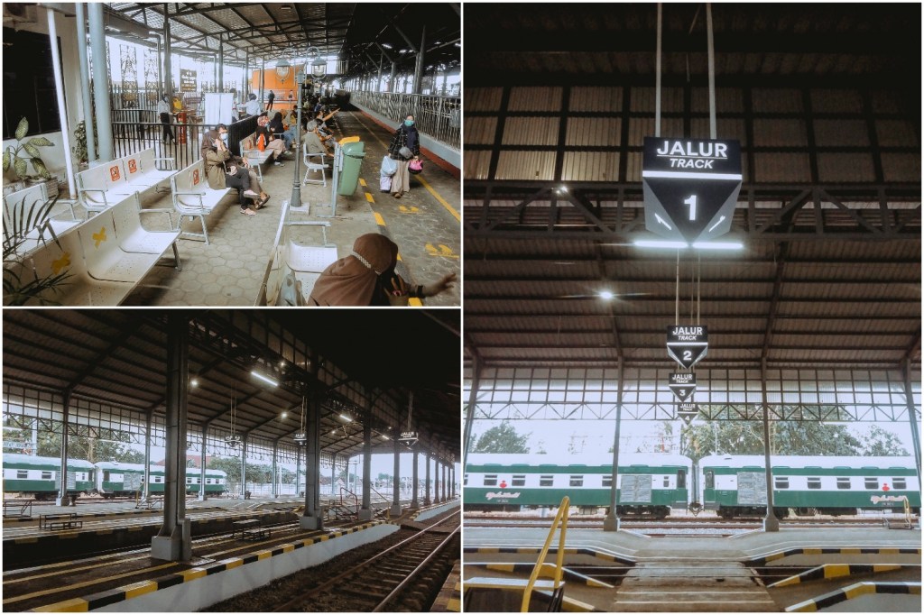 Kiri: ruang tunggu KRL di Stasiun Yogyakarta | Kanan: Stasiun Purwosari Solo