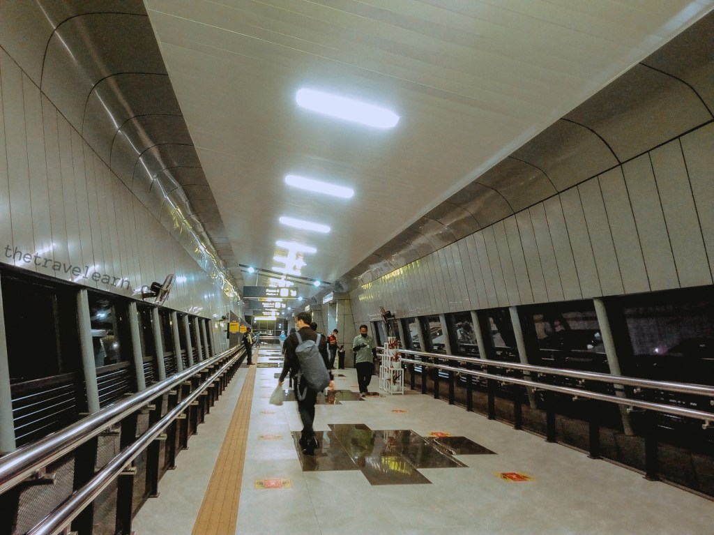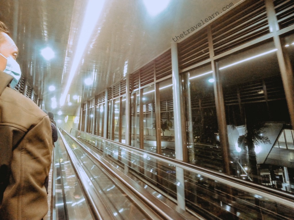Area tunggu dan jembatan itu terhubung dengan nyaman oleh sebuah travelator yang berderak dengan kecepatan sedang. Iya, travelator, karena tidak ada undakan tangganya. Ada titik untuk berfoto tepat di bawah travelator. Sayang saat itu aku seorang diri, tak seperti saat bulan Desember 2020 lalu.