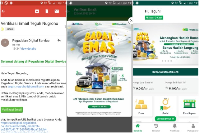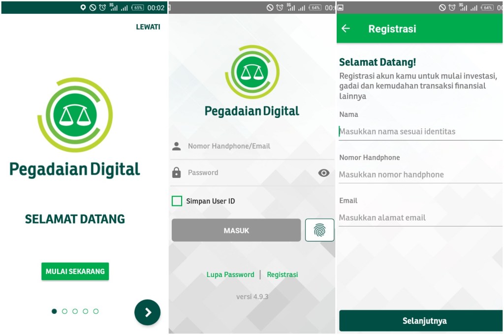 Tampilan awal dan pendaftaran di aplikasi Pegadaian Digital