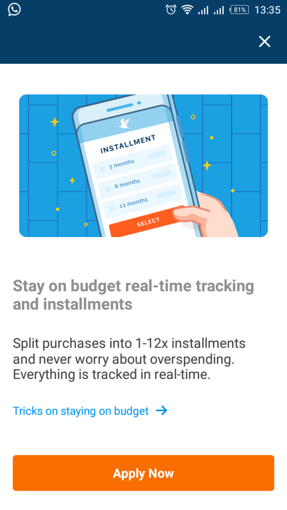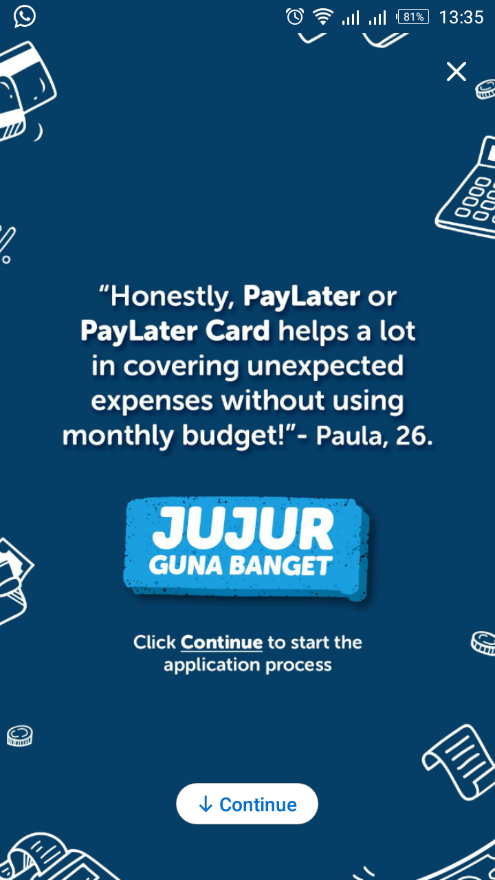 - Aplikasi akan terlebih dulu memberikan informasi seputar fitur paylater ini, termasuk tips buat mengatur keuangan, klik “Continue” / “Lanjutkan” terus sampai masuk ke laman pengisian data diri