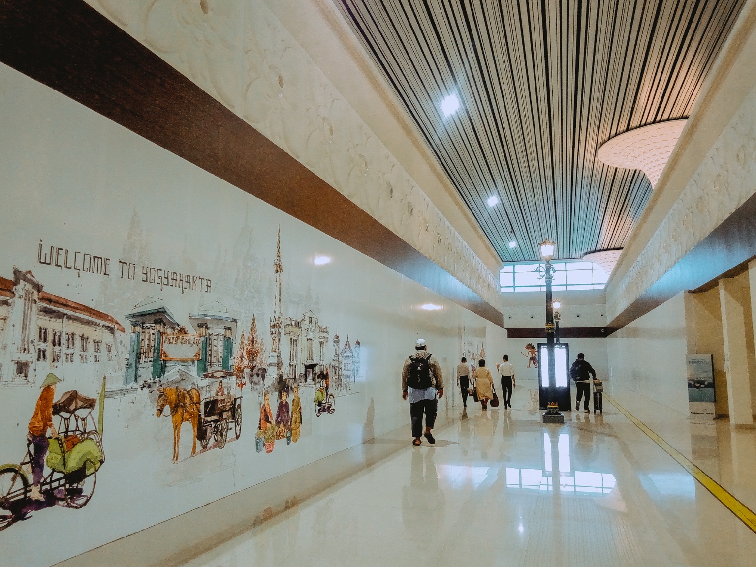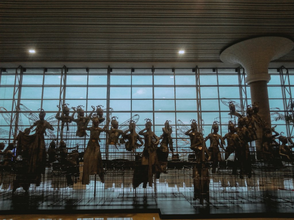 Dalam perjalanan menuju boarding room, aku diiringi dengan lukisan mural di dinding lorong yang menggambarkan budaya dan keseharian warga Jogja. Ada lampu-lampu jalanan khas Jogja juga dong, itu lho yang warna tiangnya hijau tua dan lampunya berada di dalam sangkar kaca. Bahkan ada becak juga. Boarding room lalu menyambutku dengan diorama tari tradisional, kalau nggak salah adalah Tari Bedhoyo. Cmiiw. Wah, ternyata bertebaran titik-titik instagenic di YIA.