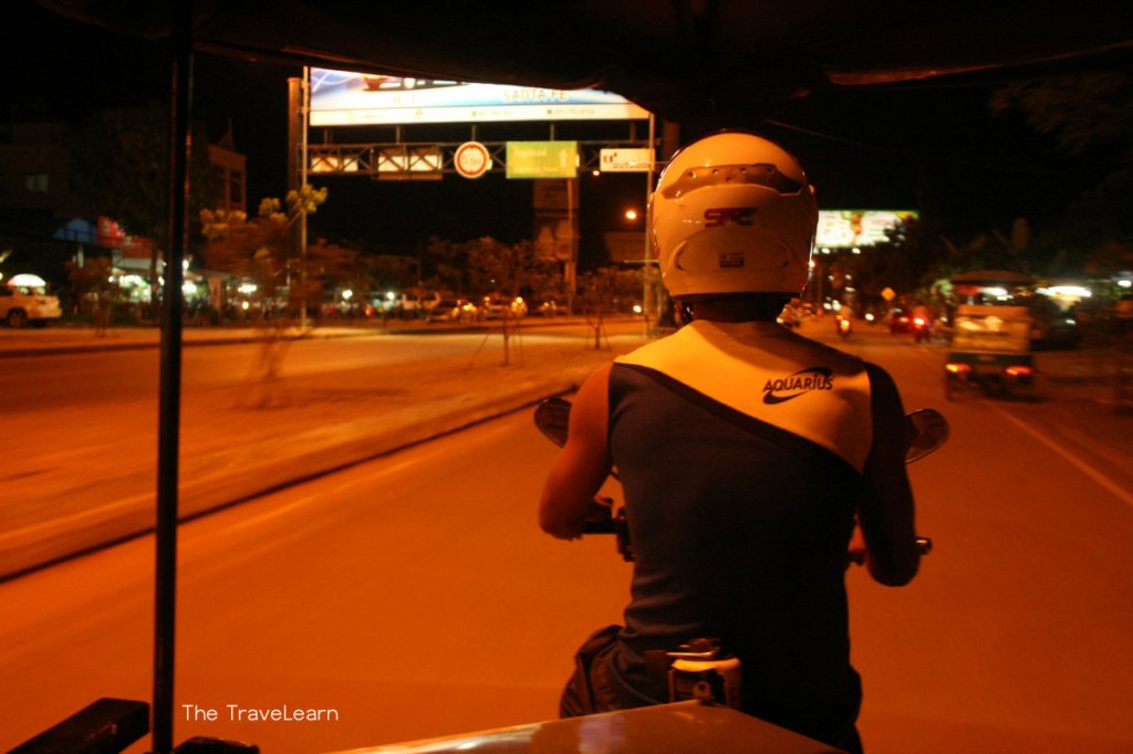 Saat sudah tiba di Siem Reap, taksi menurunkan kami di tepi jalan protokol 4 lajur lalu “mengoper” kami pada seorang sopir tuktuk. Berbekal alamat dan nomor ponsel host-ku di Couchsurfing yang kucatat secara offline, sopir tuktuk menelfonnya untuk menanyakan kepastian alamat.